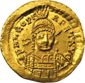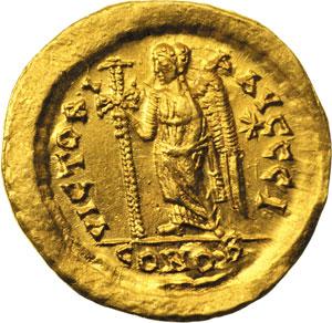 Impero Romano. Leone I (457-474). Solido, Costantinopoli. D/ DN LEO PERPET AVG. Busto elmato e corazzato di fronte, con il volto tre quarti a destra, che tiene lancia e scudo. R/ VICTORIA AVCCC I. Vittoria stante a sinistra tiene lunga croce. A destra, stella. In esergo: CONOB. RIC 605. AU. g. 4.48 mm. 21.00 SPL+/SPL. Raro di questa qualitv†. Fondi lucenti.