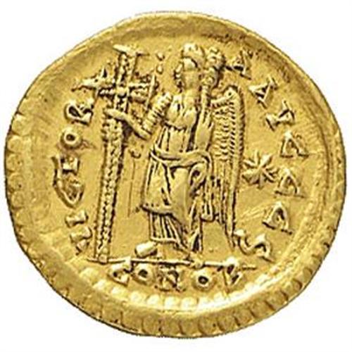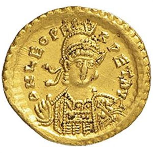 Impero Romano. Leone I (457-474). Solido, Costantinopoli. D/ DN LEO PERPET AVG. Busto elmato e corazzato di fronte, con lancia e scudo. R/ VICTORIA AVGGGS. Vittoria, stante a sinistra, tiene una lunga croce. Nel campo a destra, stella. In esergo: CONOB. LRC 525. gr. 4.47 AU. qSPL/BB+.