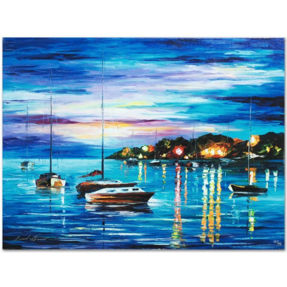 Leonid Afremov's (1955-2019) masterful use of color and texture make his paintings unique collectibles that are sure to brighten any wall. "Out All Night" is a limited edition giclee on canvas. The piece is numbered and bears the artist's authorized signature. This piece comes gallery wrapped. Includes Letter of Authenticity. Measures approx. 24" x 18" (image). Reference #: 237105.