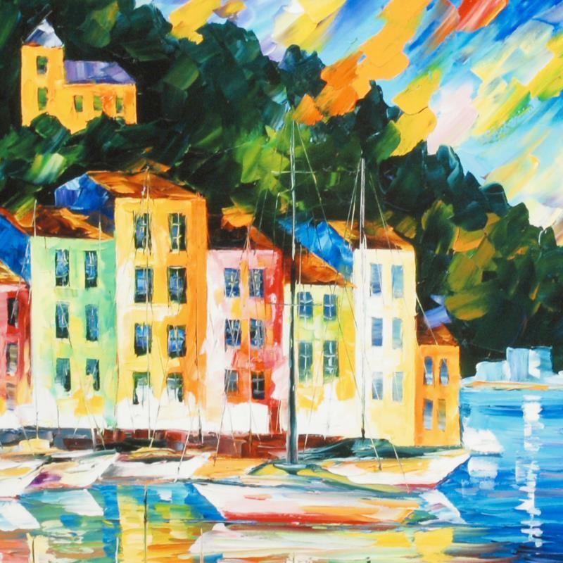 Leonid Afremov's (1955-2019) masterful use of color and texture make his paintings unique collectibles that are sure to brighten any wall. "Portofino Harbor - Italy" is a limited edition giclee on canvas. The piece is numbered and bears the artist's authorized signature. This piece comes gallery wrapped. Includes Letter of Authenticity. Measures approx. 24" x 18" (image).
