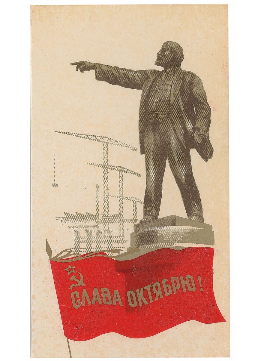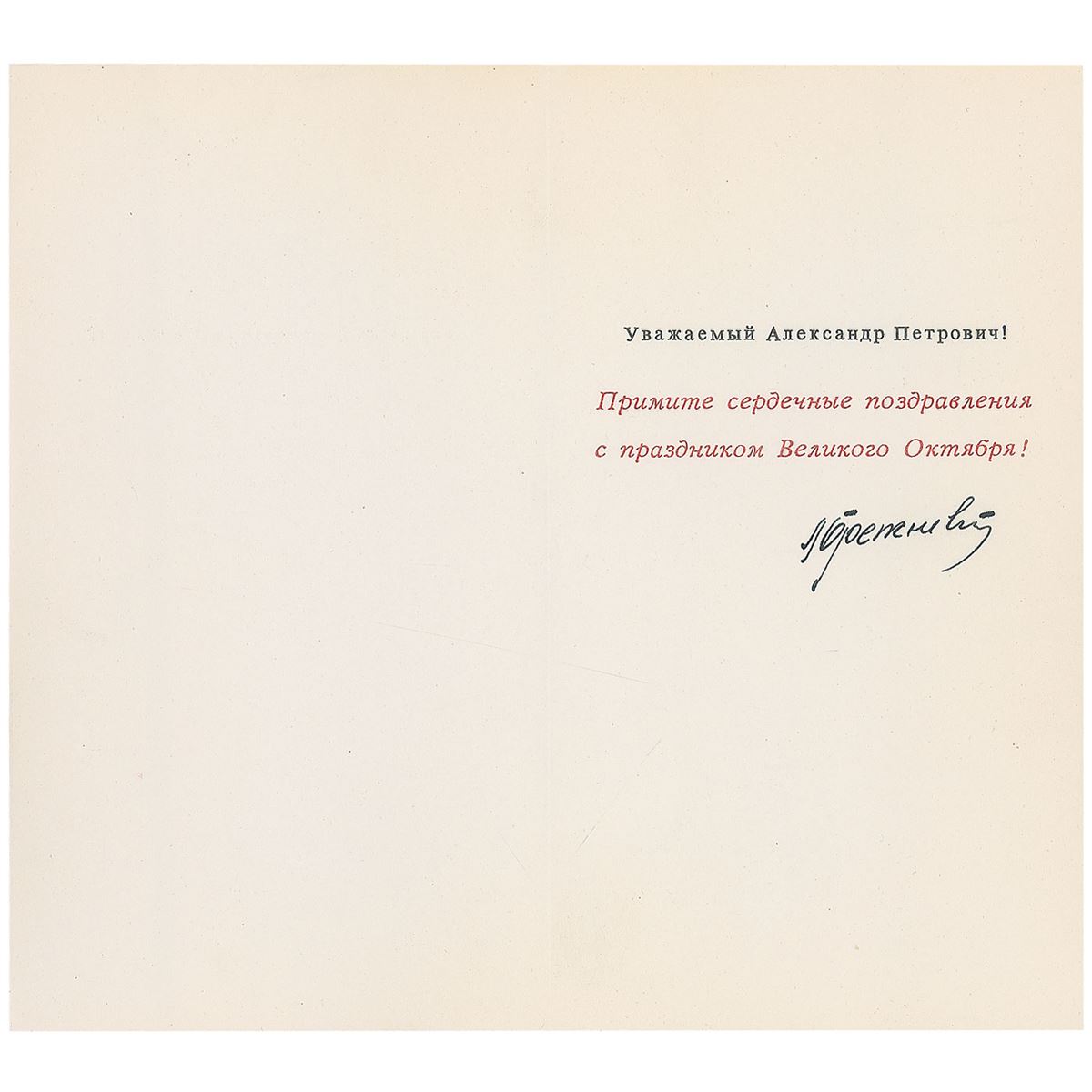 Uncommon Russian greeting card featuring an image of Lenin with a translucent overlay of the Soviet flag bearing the text [translated] “Glorious October!,” measuring 4 x 7 closed, signed inside beneath a printed Cyrillic greeting in fountain pen by Brezhnev. In fine condition, with light soiling to the cover.