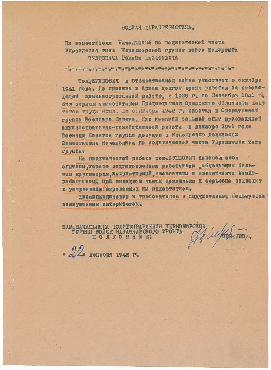 World War II–dated DS in Cyrillic, signed “Brezhnev,” one page, 8.25 x 11.25, December 22, 1942. Document recommending Roman Yeliseyevich Vuldovich for a promotion. In part (translated): "Comrade Vuldovich has been participating in the war since October of 1941. Before being drafted into the army, he performed managerial and administrative work for some time…Since he had a great deal of experience in managerial and business administration work, the Group’s Military Council permitted him to assume the position of Deputy Head of Political Affairs of the Group’s Logistics Section…Comrade Vuldovich has shown himself to be an experienced, well-trained worker who sees the big picture, is a self-starter, and is an energetic and diligent political worker.” Expected document wear, uniform toning, various small edge tears, and binding holes to left edge, otherwise fine condition.