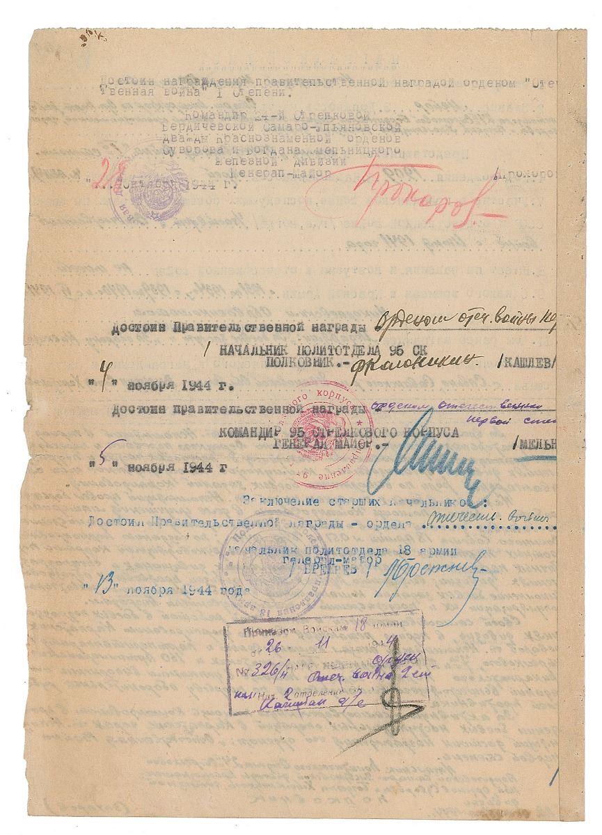 World War II-dated DS in Cyrillic, one page both sides, 8 x 11.25, November 13, 1944. Document awarding Shulim Froymovich Nepomnyeschiy with an order of the Patriotic War First Class. Signed on the reverse in blue ink by Brezhnev. In very good to fine condition, with wear to the right edge and binding holes to the left edge. Accompanied by additional sheets related to the document, as well as files on the recipient of the award.