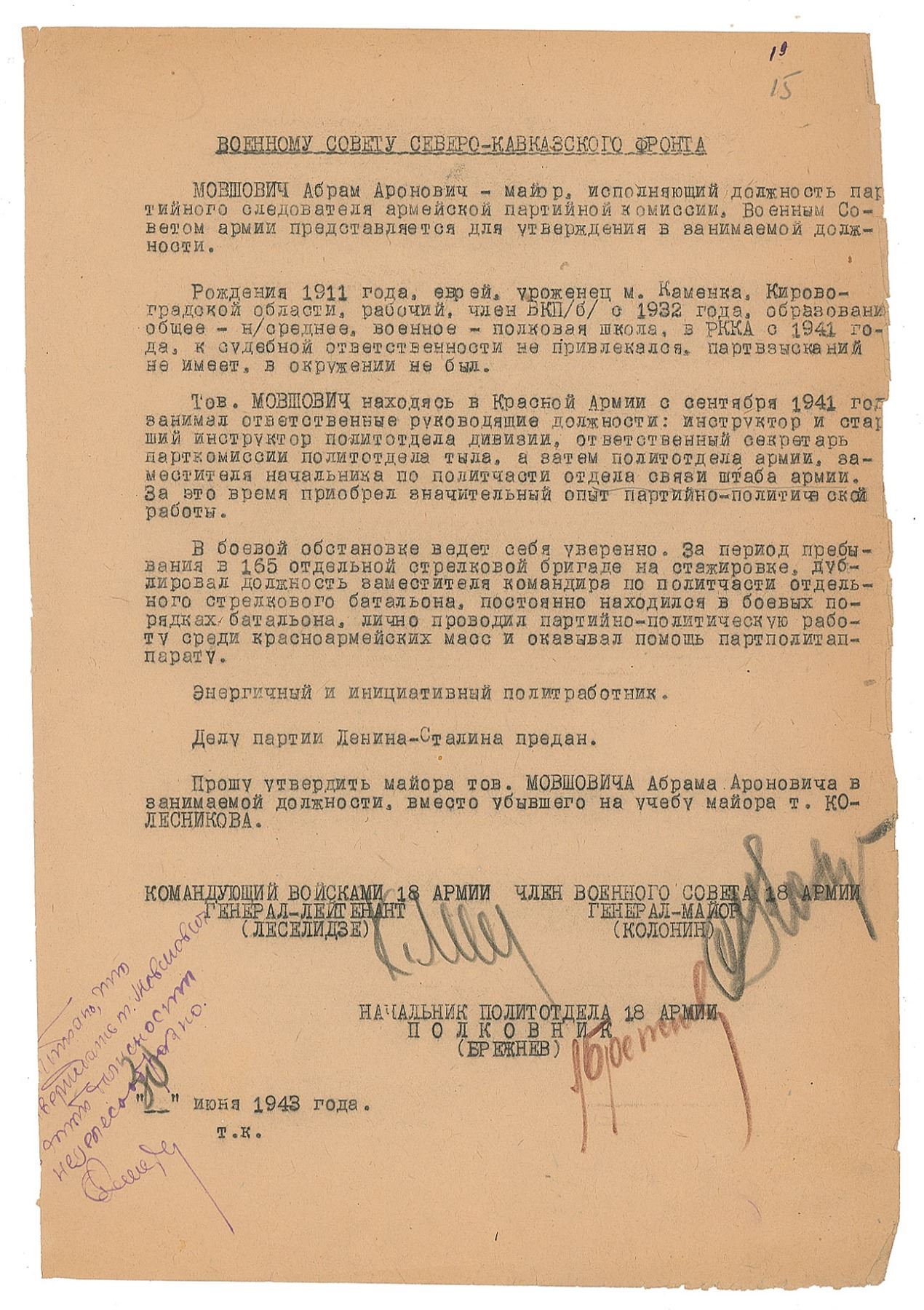 Untranslated DS in Cyrillic, one page, 8 x 11.75, June 8, 1943. Official Russian military document, document is ordering Major Abram Movshovich to stay on the already occupied position of (Communist) Party investigator of the Army Party Commission. Signed at the conclusion in brown pencil by Brezhnev, and also signed by important Soviet WWII commander Konstantin Leselidze, for whom a town is named today. In very good to fine condition, with edge wear, tears, and trimming.