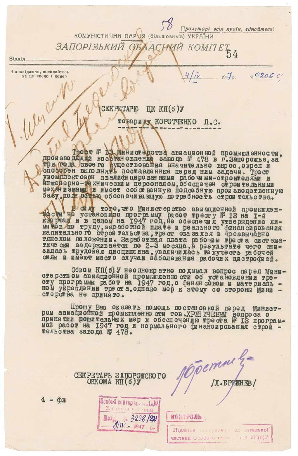Leader of the Soviet Union (1907–1982) from 1964 until his death. DS, in Russian, signed “Brezhnev,” one page, 7.75 x 12, April 4, 1947. Untranslated document signed at the conclusion in purple ink by Brezhnev. In very good condition, with intersecting folds, scattered edge wear and tears, and several office notations and stamps, one lightly affecting portions of text.