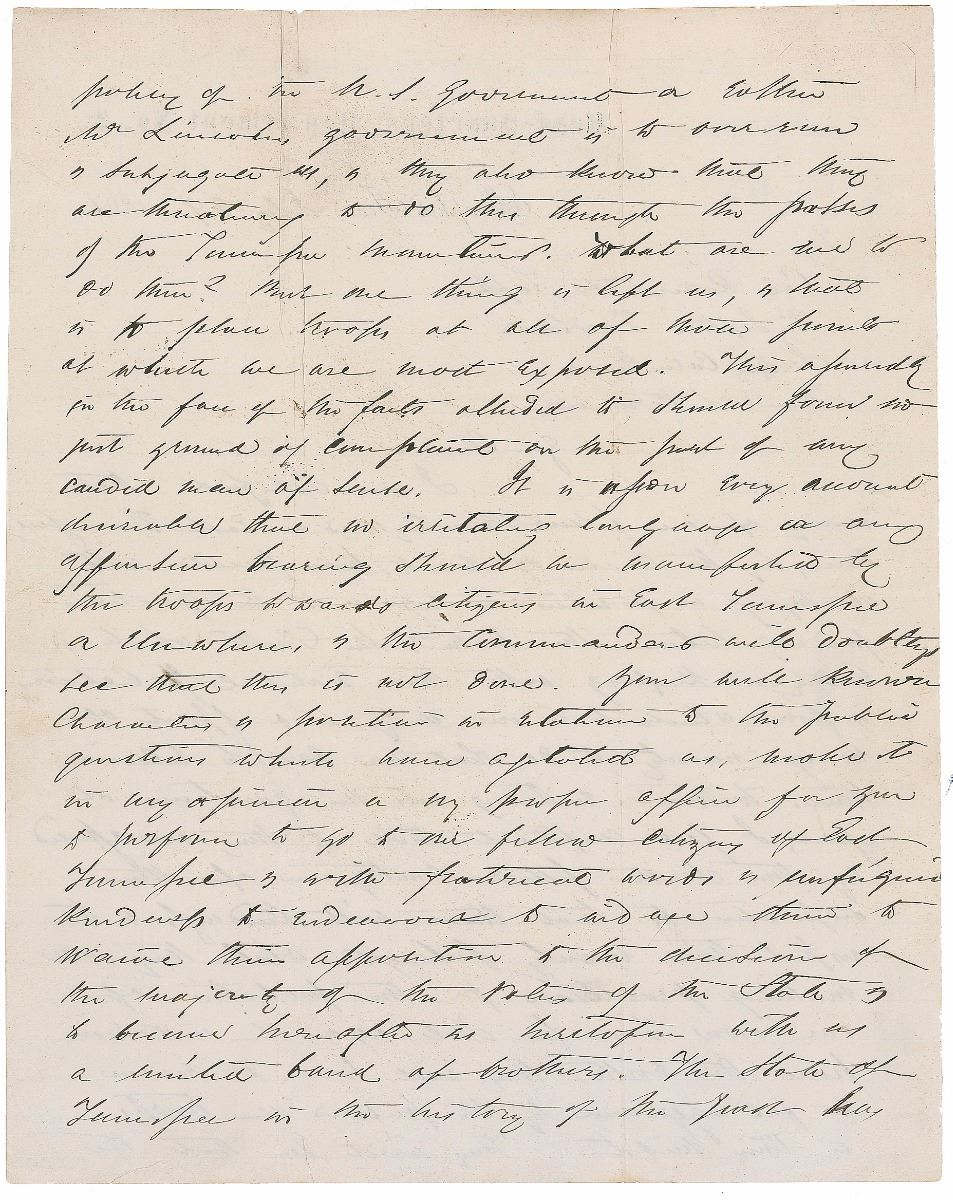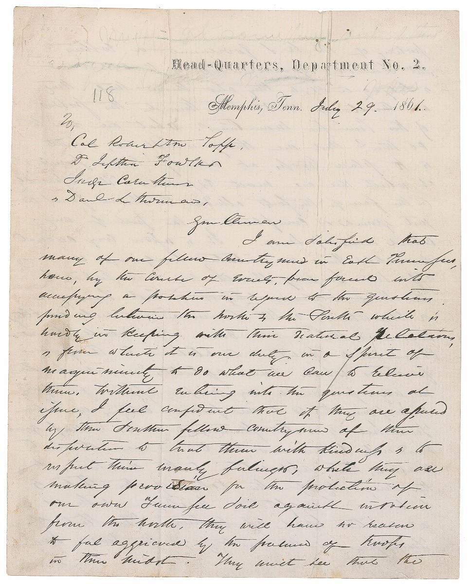 As one of the border states, Tennessee was divided on the subjects of slavery and secession: while pro-slavery sentiment was strong in middle and west Tennessee, the eastern part of the state was strongly pro-Union and opposed to secession. Public opinion began to change, however, after President Lincoln responded to the attack on Fort Sumter by summoning federal troops to suppress the Southern rebellion. Feeling their state’s security at risk with the specter of Lincoln’s troops on the horizon, many of the Unionists flipped and and voted for secession, making Tennessee the last state to leave the Union at the beginning of July 1861. Polk’s stirring letter, imbued with the eloquence of a preacher’s sermon, calls for the people of Tennessee to set aside their political disagreements and unite to protect their beloved state—he thought that even Unionists believed themselves Tennesseans first and foremost. This idealized vision of a united Tennessee never materialized, and the east remained a Republican stronghold that proved a thorn in the side of Confederate troops as a primary location for guerrilla warfare.