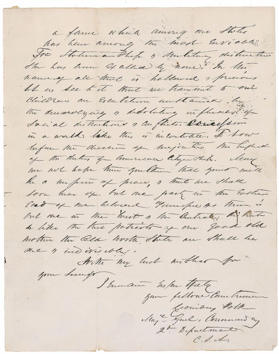 Episcopal Bishop of Louisiana (1806–1864) whose West Point classmate, Jefferson Davis, urged him to accept an appointment as a Confederate general despite a lack of combat experience. Dubbed the ‘Fighting Bishop,’ Polk was killed in action during the Atlanta Campaign. Civil War–dated ALS signed “Leonidas Polk, Majr Genl, Commanding, 2d Department, C.S.A.,” three pages on two sheets, 7.75 x 9.75, Head-Quarters, Department No. 2 letterhead, July 29, 1861. Letter to Col. Robert William Topp, Dr. Fowlks, Judge Caruthers, and Daniel Leatherman. In full: “I am satisfied that many of our fellow countrymen in East Tennessee, have, by the course of events, been forced with occupying a position in regard to the question pending between the North & the South which is hardly in keeping with their natural relations, & from which it is our duty in a Spirit of magnanimity to do what we can to relieve them. Without entering into the questions at issue, I feel confident that if they are assured by their Southern fellow countrymen of their disposition to treat them with kindness & to respect their manly feelings, while they are making provision for the protection of our own Tennessee Soil against invasion from the North, they will have no reason to feel aggrieved by the presence of troops in their midst. They must see that the policy of the U.S. Government on whether Mr. Lincoln's government is to overrun & subjugate us, & they also know that they are threatening to do this through the passes of the Tennessee mountains. What are we to do then? But one thing is left us, & that is to place troops at all of those points at which we are most exposed. This assuredly in the face of the facts alluded to should form no just ground of complaint on the part of any candid man of sense. It is upon every amount desirable that no irritating language or any offensive bearing should be manifested by the troops towards citizens in East Tennessee or elsewhere, & the commanders will doubtless see that this is not done. Your well known Character & position in relation to the public questions which have agitated us, make it in my opinion a very proper office for you to perform to go to our fellow citizens of East Tennessee & with fraternal words & unfeigned kindness to endeavour to induce them to waive their opposition to the decision of the majority of the voters of the State & to become hereafter as heretofore with us a united band of brothers. The State of Tennessee in the history of the year has a fame which among our States has been among the most enviable. For Statesmanship & military distinction she has been excelled by none. In the name of all that is hallowed & precious let us see to it that we transmit to our children an escutcheon unstained by the demoralizing…influences of Social distractions & conflict. Concession in a world like this is inevitable. To bow before the direction of majorities the highest of the duties of American citizenship. May we not hope these gentlemen through you will be a mission of peace, & trust we shall soon bear of but one party in the Eastern End of our beloved Tennessee as there is but one in the East & the Central, district & like the true patriots of our good old mother the Old North State we shall be one & indivisible.” Intersecting folds (one vertical fold passing through a single letter of the signature), scattered soiling, and some show-through from writing to opposing sides, otherwise fine condition.