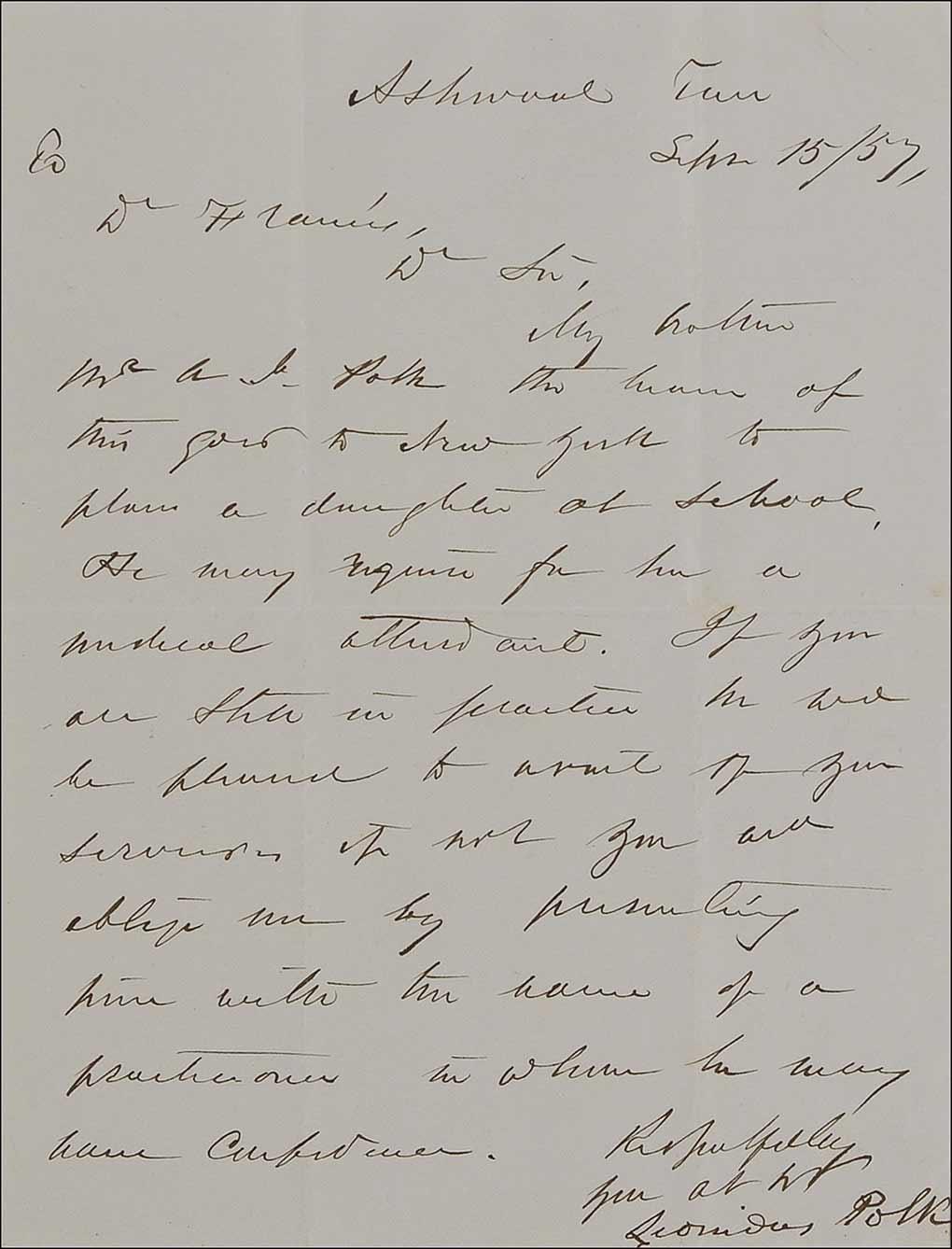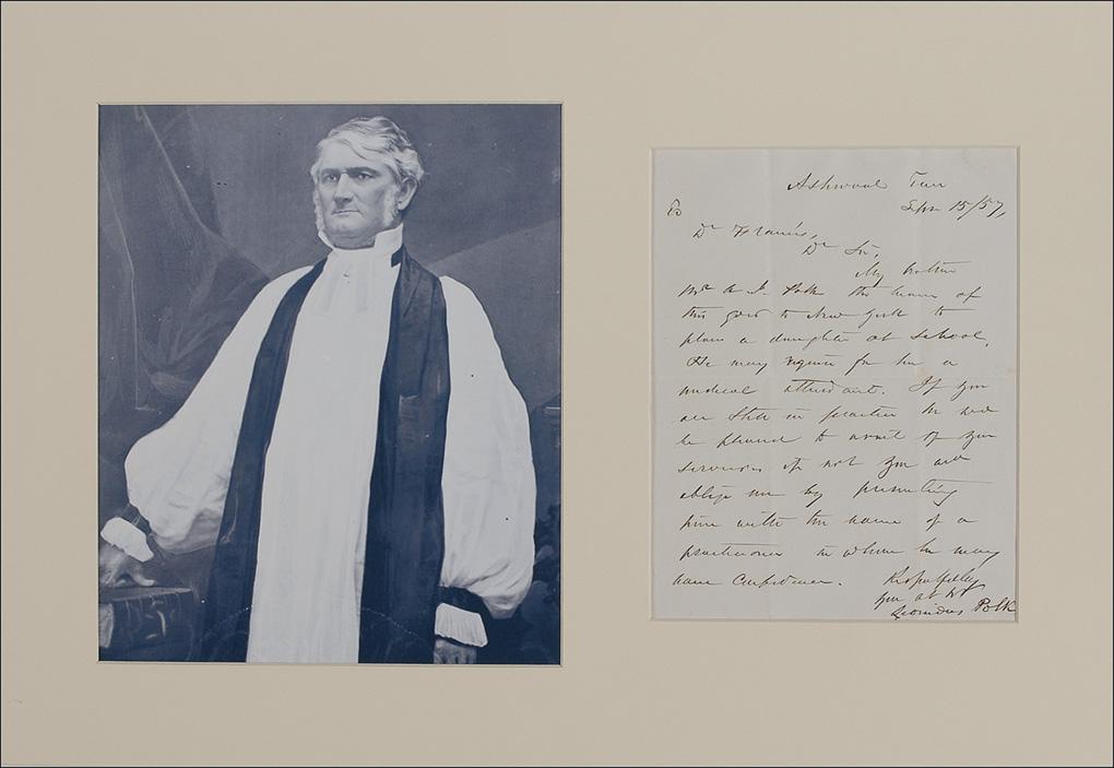 Episcopal Bishop of Louisiana (1806-1864). His West Point classmate, Jefferson Davis, urged him to accept an appointment as a Confederate general during the Civil War, despite having had no combat experience. His rank earned him the nickname “The Fighting Bishop.” Polk, a second cousin of James K. Polk, defeated Grant at Belmont and commanded large forces at Shiloh and Chickamauga. Gen. Braxton Bragg ordered him to be court-martialed for not following orders at Chickamauga, but Davis reinstated him. Polk was killed in action near Pine Mountain, Georgia, in June 1864, and although Davis lavished the highest praise on him as a military leader, most of his peers felt his real talents lay in his ministry. ALS, one page, 6 x 7.75, September 15, 1857. Letter to Dr. Francis looking for assistance for his niece. In part: “My brother…goes to New York to place a daughter at school. He may require for her a medical attendant. If you are still in practice he would be pleased to avail of your services if not you would oblige me by presenting him with the name of a pediatrician in whom he may have confidence.” Matted with a glossy portrait to an overall size of 18.5 x 13. In fine condition, with intersecting folds, one through a single letter of signature, and a touch of trivial soiling.