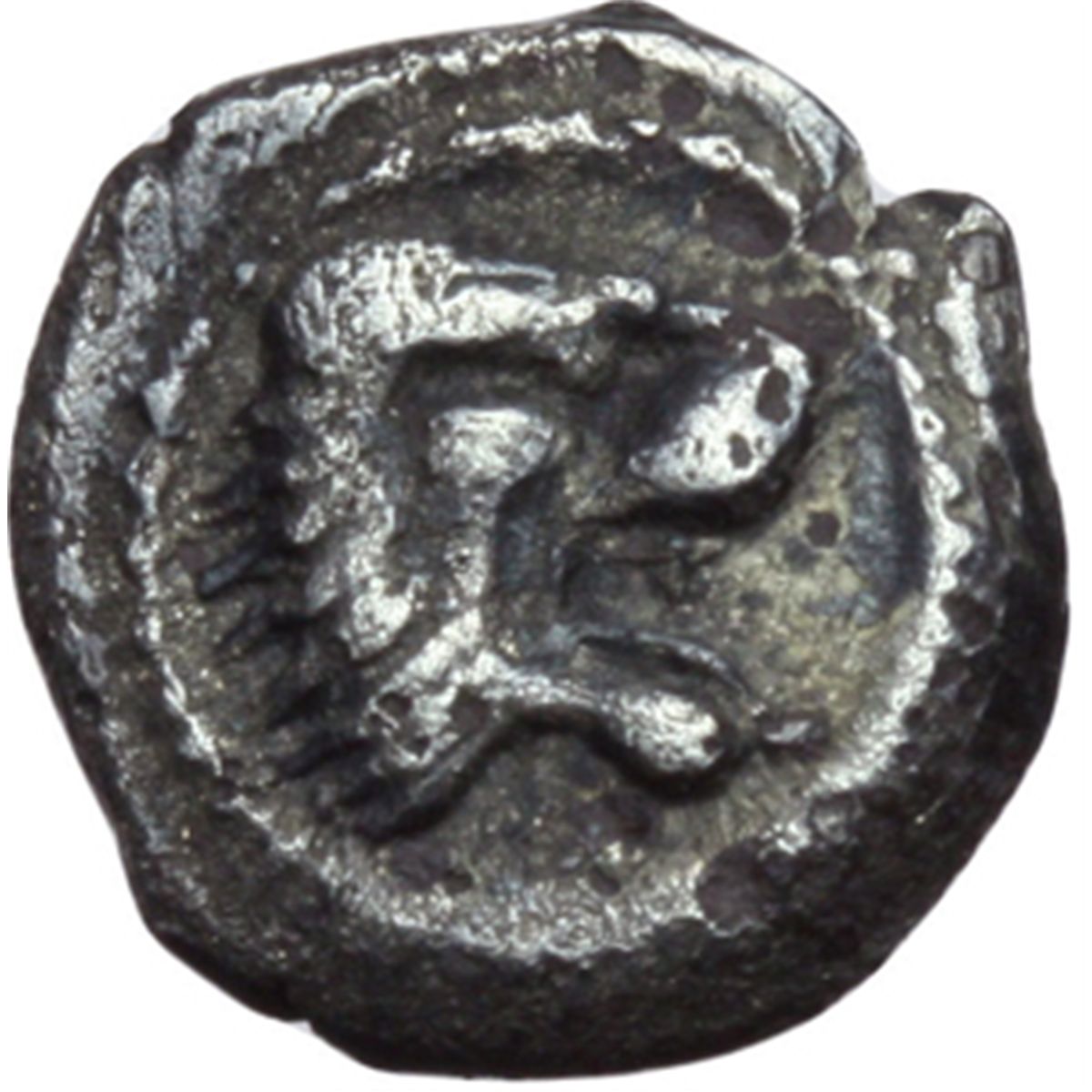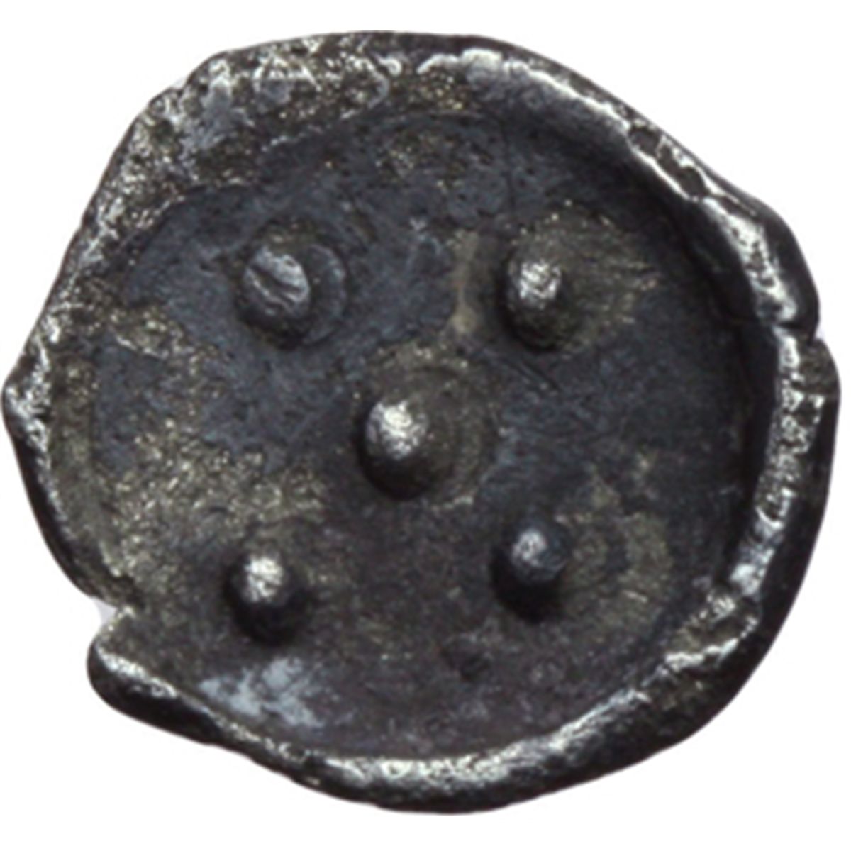 Mondo Greco. Sicilia. Leontini. Pentonkion, 475-466 a.C. D/ Testa di leone a destra, con le fauci aperte. R/ Cinque globetti. SNG Lioyd 1051. AG. g. 0.25 mm. 7.50 RR. Bel BB.