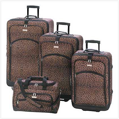 Leopard Print Luggage Ensemble **|**|** Leopard Print Luggage Ensemble WFM-13349 - Whether its a trip around the world or a quick weekend get-away, this luggage set gets you there with style to spare! Fashionable wheeled luggage quartet shows its wild side in a luscious matching leopard print. Plenty of zippered pockets hold every essential for the savvy traveler. Set includes Large, Medium and Small wheeled bags; matching duffle bag. Polyester. Spot clean only. May Require Additional Freight Charge Large: 18 x 11" x 30" high; medium: 16" x 9" x 26" high; small: 14" x 8" x 22" high; duffle bag: 17" x 7" x 11" high. Set of 4"