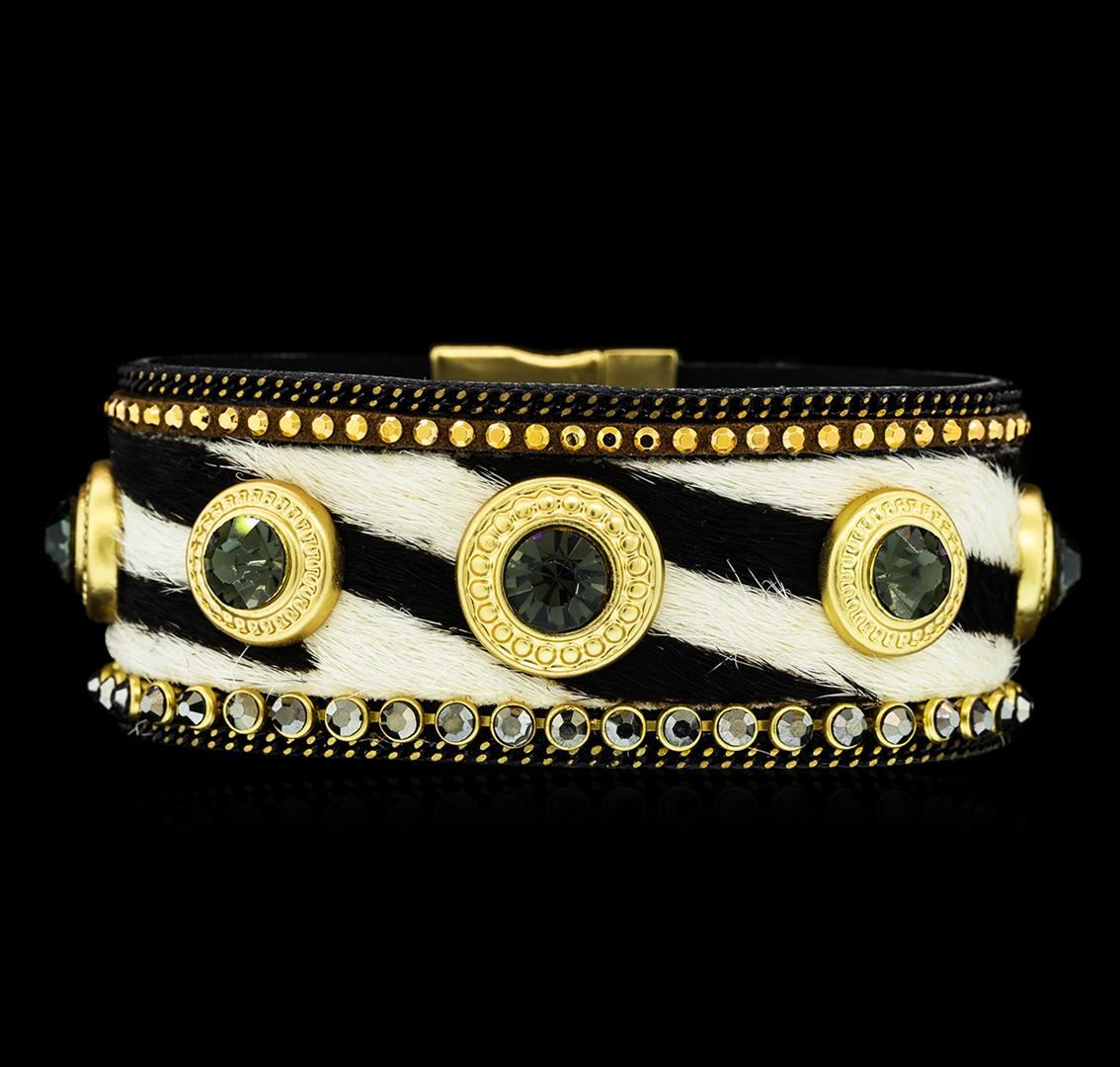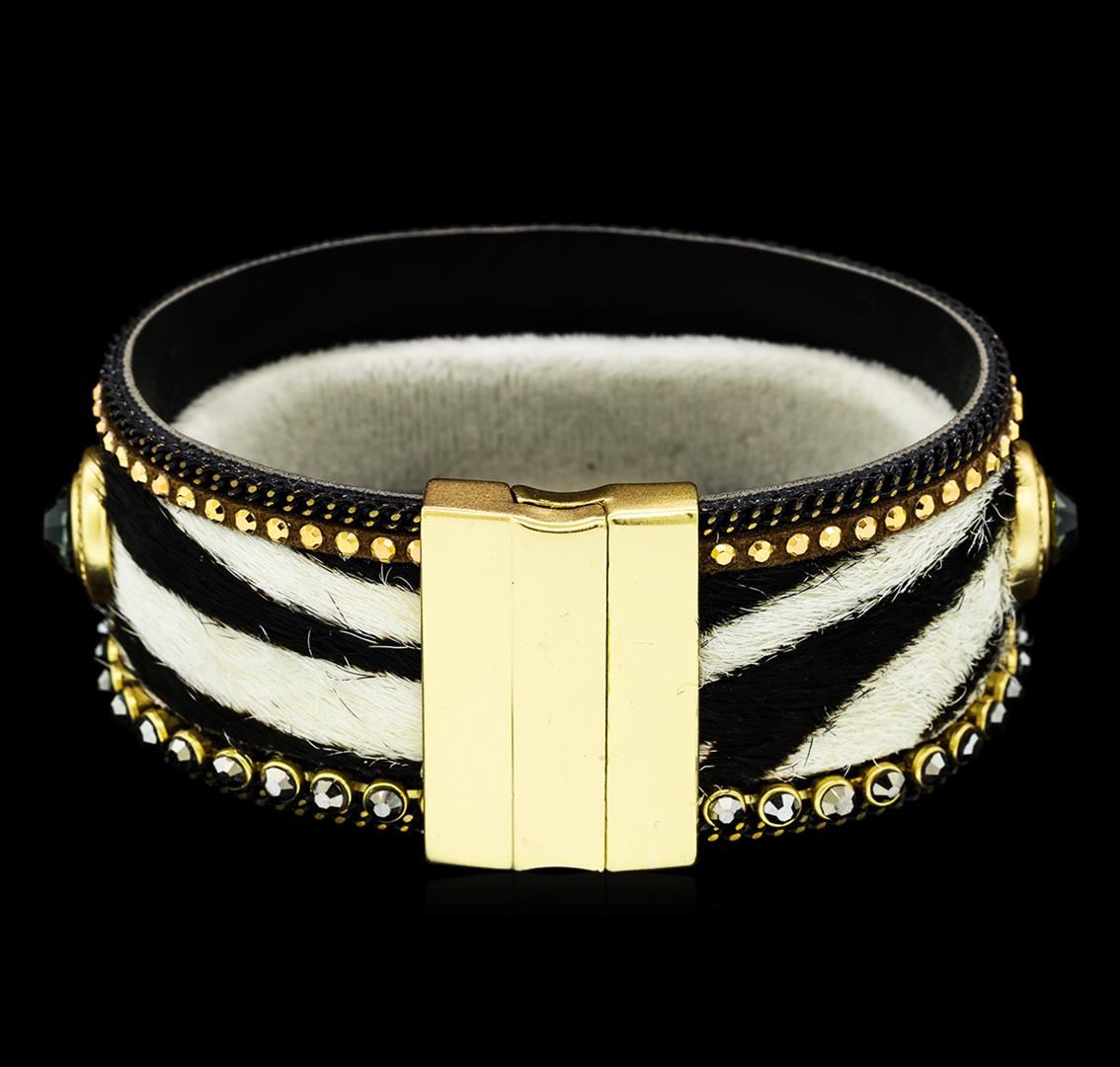 High end designer jewelry. Leopard Skin Crystal Bracelet - Gold Plated. Gold Pltd Magnetic Clasp. Brown/ Gold. 7.25inches.