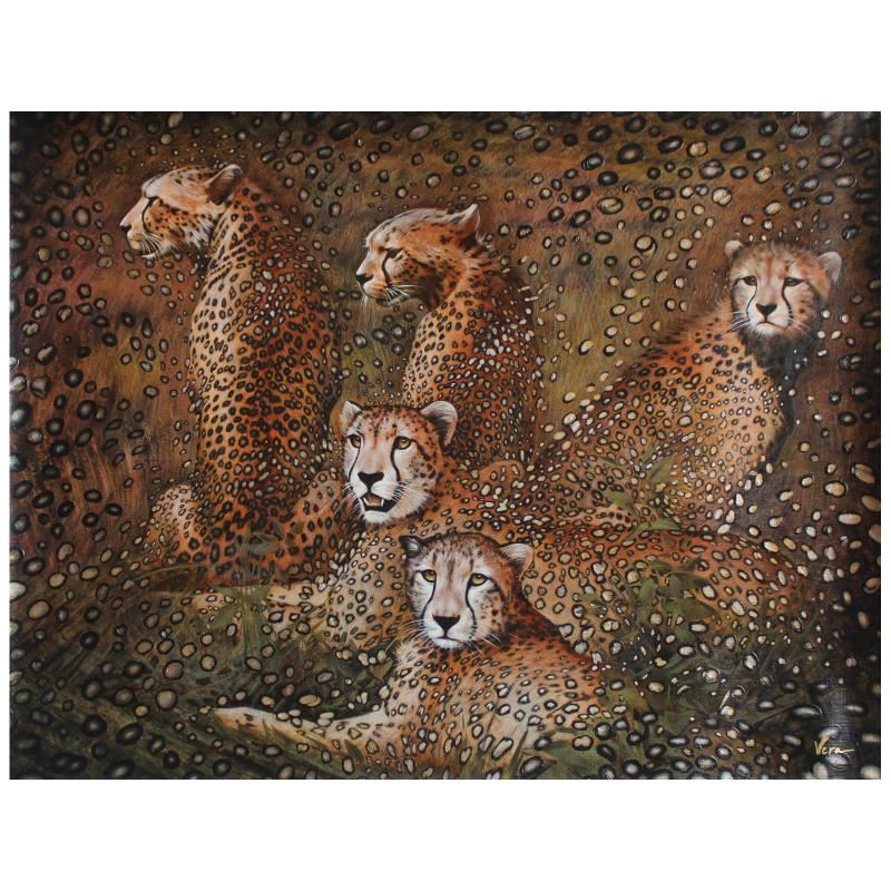 "Leopards" is an original Oil on Canvas by Vera V. Goncharenko. The piece is hand signed and comes with a Certificate of Authenticity. Measures approximately 35" x 27".