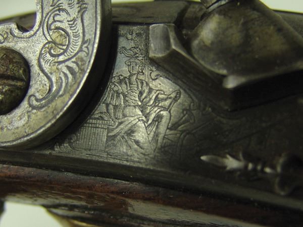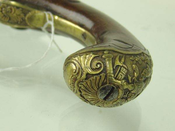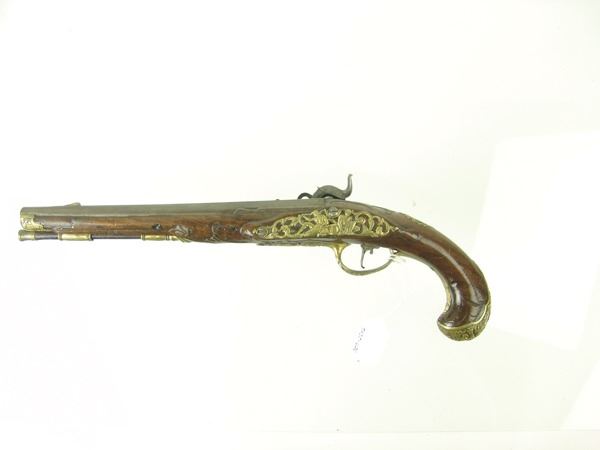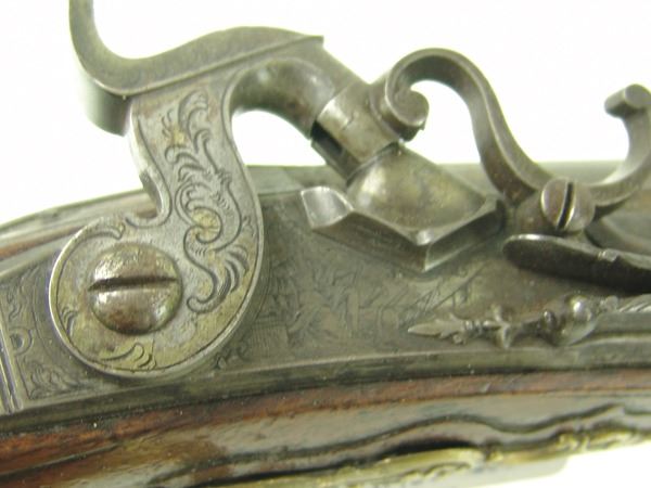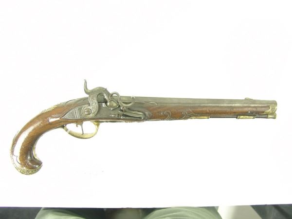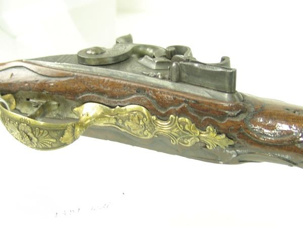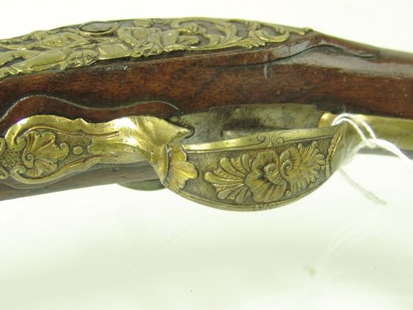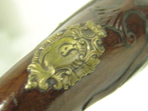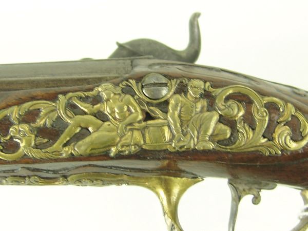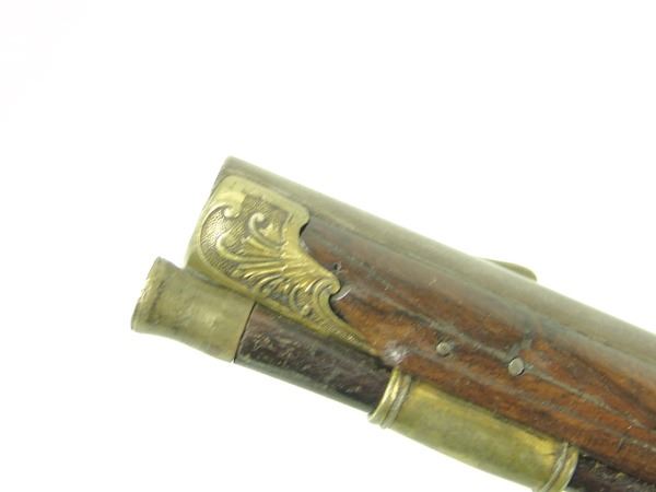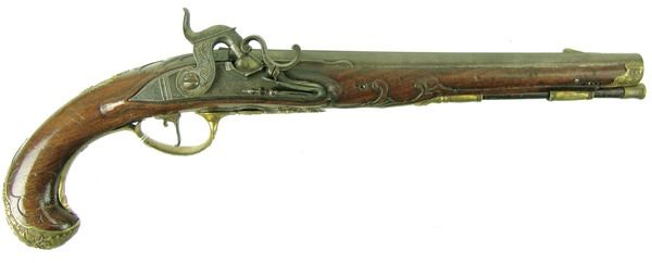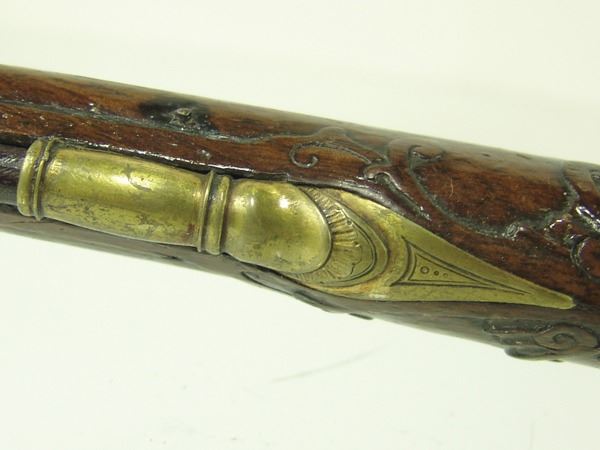 Late 1700s 17" Rare, .55 cal. (flintlock) holster pistol with gilt brass mounts, relief carved stock, 10-1/2" pinned barrel, engraved hardware, and original ramrod, converted to percussion.