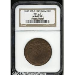 <B>Leopold I 10 Centimes 1832 With Period, </B></I>KM2.1, MS65 Red and Brown NGC, a truly choice example with abundant orange mint luster. <BR><BR><B>Important notice:</B> Heritage usually auctions material at the rate of 200-250 lots per hour. On some occasions eBay Live bid software or the Internet may not be able to keep up with the pace of the auction. We recommend placing a realistic absentee bid now as insurance to avoid disappointment. Occasionally the auctioneer may eliminate or reject an eBay Live bid, and the auctioneer may also reopen a lot after the close of the eBay live bidding (usually because we missed an audience bid), and may reject your bid even if it shows you as the winning bidder. By bidding via eBay Live, you agree that Heritage may award the lot to another bidder at its sole discretion under the circumstances described above or any other reasonable circumstances. Since eBay bids are not shown to us until we open the lot on the floor, we treat those bids just like floor bids. In most cases the floor responds before the eBay bid is presented to us, due to Internet lag time, so for consistency we have made it a policy that floor bids are always considered first over tie eBay live bids. Also please note that all Heritage lots purchased through eBay Live carry a 20% Buyer's Premium. Please make sure you read the Terms and Conditions before you bid.