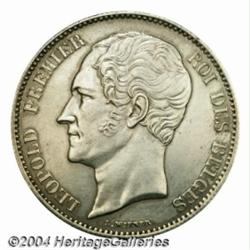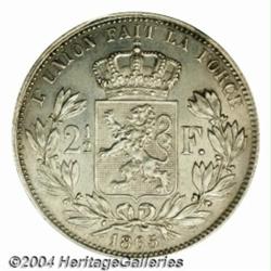 Leopold I 2-1/2 francs 1865 Large Head, Large head left/Crowned arms, Dup-929, KM12, XF, lightly polished. Originally struck only in proof, and not released as circulation coinage, this issue is Extremely Rare and seldom appears in any condition.From the Marshall Frumer Collection. Important notice: Heritage usually auctions material at the rate of 200-250 lots per hour. On some occasions eBay Live bid software or the Internet may not be able to keep up with the pace of the auction. We recommend placing a realistic absentee bid now as insurance to avoid disappointment. Occasionally the auctioneer may eliminate or reject an eBay Live bid, and the auctioneer may also reopen a lot after the close of the eBay live bidding (usually because we missed an audience bid), and may reject your bid even if it shows you as the winning bidder. By bidding via eBay Live, you agree that Heritage may award the lot to another bidder at its sole discretion under the circumstances described above or any other reasonable circumstances. Also please note that all Heritage lots purchased through eBay Live carry a 20% Buyer's Premium. Please make sure you read the Terms and Conditions before you bid.