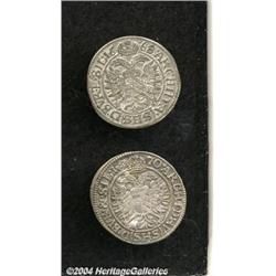 <B>Leopold I 3 Kreuzer pair as follows:</B></I> Breslau Mint KM-7, 1668 SHS and 1670 SHS. Both Very Fine. 2 coins <BR><BR><B>Important notice:</B> Heritage usually auctions material at the rate of 200-250 lots per hour. On some occasions eBay Live bid software or the Internet may not be able to keep up with the pace of the auction. We recommend placing a realistic absentee bid now as insurance to avoid disappointment. Occasionally the auctioneer may eliminate or reject an eBay Live bid, and the auctioneer may also reopen a lot after the close of the eBay live bidding (usually because we missed an audience bid), and may reject your bid even if it shows you as the winning bidder. By bidding via eBay Live, you agree that Heritage may award the lot to another bidder at its sole discretion under the circumstances described above or any other reasonable circumstances. Since eBay bids are not shown to us until we open the lot on the floor, we treat those bids just like floor bids. In most cases the floor responds before the eBay bid is presented to us, due to Internet lag time, so for consistency we have made it a policy that floor bids are always considered first over tie eBay live bids. Also please note that all Heritage lots purchased through eBay Live carry a 20% Buyer's Premium. Please make sure you read the Terms and Conditions before you bid.