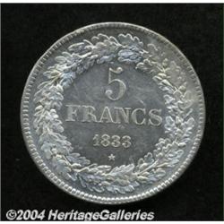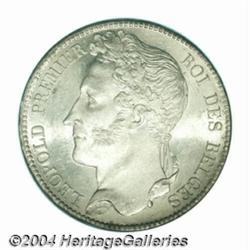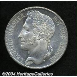 Leopold I 5 francs 1833, Position A Bust left/Date and value, Dup-27, Bogaert-27A, KM3.1, Brilliant Uncirculated.From the Marshall Frumer Collection. Important notice: Heritage usually auctions material at the rate of 200-250 lots per hour. On some occasions eBay Live bid software or the Internet may not be able to keep up with the pace of the auction. We recommend placing a realistic absentee bid now as insurance to avoid disappointment. Occasionally the auctioneer may eliminate or reject an eBay Live bid, and the auctioneer may also reopen a lot after the close of the eBay live bidding (usually because we missed an audience bid), and may reject your bid even if it shows you as the winning bidder. By bidding via eBay Live, you agree that Heritage may award the lot to another bidder at its sole discretion under the circumstances described above or any other reasonable circumstances. Also please note that all Heritage lots purchased through eBay Live carry a 20% Buyer's Premium. Please make sure you read the Terms and Conditions before you bid.