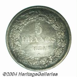 Leopold I 5 francs 1834, Position A, Bust left/Date and value, Dup-82, Bogaert-82A, KM3.1, VF with hairlines and areas of porosity on the portrait.From the Marshall Frumer Collection. Important notice: Heritage usually auctions material at the rate of 200-250 lots per hour. On some occasions eBay Live bid software or the Internet may not be able to keep up with the pace of the auction. We recommend placing a realistic absentee bid now as insurance to avoid disappointment. Occasionally the auctioneer may eliminate or reject an eBay Live bid, and the auctioneer may also reopen a lot after the close of the eBay live bidding (usually because we missed an audience bid), and may reject your bid even if it shows you as the winning bidder. By bidding via eBay Live, you agree that Heritage may award the lot to another bidder at its sole discretion under the circumstances described above or any other reasonable circumstances. Also please note that all Heritage lots purchased through eBay Live carry a 20% Buyer's Premium. Please make sure you read the Terms and Conditions before you bid.