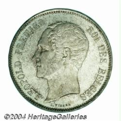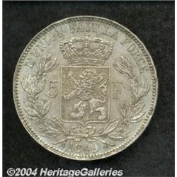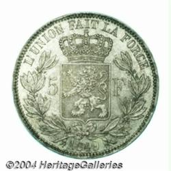 Leopold I 5 francs 1849, Large 9 Bust left/Crowned arms, Dup-410 var., KM17, lightly toned, Choice Proof. Extremely Rare!From the Marshall Frumer Collection. Important notice: Heritage usually auctions material at the rate of 200-250 lots per hour. On some occasions eBay Live bid software or the Internet may not be able to keep up with the pace of the auction. We recommend placing a realistic absentee bid now as insurance to avoid disappointment. Occasionally the auctioneer may eliminate or reject an eBay Live bid, and the auctioneer may also reopen a lot after the close of the eBay live bidding (usually because we missed an audience bid), and may reject your bid even if it shows you as the winning bidder. By bidding via eBay Live, you agree that Heritage may award the lot to another bidder at its sole discretion under the circumstances described above or any other reasonable circumstances. Also please note that all Heritage lots purchased through eBay Live carry a 20% Buyer's Premium. Please make sure you read the Terms and Conditions before you bid.
