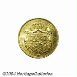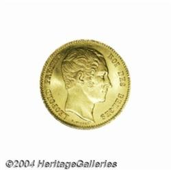 Leopold I gold 25 francs 1850, with slash after 900, Bust right/Crowned and Mantled arms, Dup 454, Fr-4, KM13.2, Brilliant Uncirculated. Very Rare!From the Marshall Frumer Collection. Important notice: Heritage usually auctions material at the rate of 200-250 lots per hour. On some occasions eBay Live bid software or the Internet may not be able to keep up with the pace of the auction. We recommend placing a realistic absentee bid now as insurance to avoid disappointment. Occasionally the auctioneer may eliminate or reject an eBay Live bid, and the auctioneer may also reopen a lot after the close of the eBay live bidding (usually because we missed an audience bid), and may reject your bid even if it shows you as the winning bidder. By bidding via eBay Live, you agree that Heritage may award the lot to another bidder at its sole discretion under the circumstances described above or any other reasonable circumstances. Also please note that all Heritage lots purchased through eBay Live carry a 20% Buyer's Premium. Please make sure you read the Terms and Conditions before you bid.