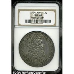 Leopold I (the Hogmouthed) taler 1704, Hall mint Bust right/Crowned arms in order chain, Dav-1003, KM644.4, MS65 NGC. Light gray toning with a razor sharp strike and underlying luster yielding a nice iridescent appearance. A truly superior example.From the Osage Collection. Important notice: Heritage usually auctions material at the rate of 200-250 lots per hour. On some occasions eBay Live bid software or the Internet may not be able to keep up with the pace of the auction. We recommend placing a realistic absentee bid now as insurance to avoid disappointment. Occasionally the auctioneer may eliminate or reject an eBay Live bid, and the auctioneer may also reopen a lot after the close of the eBay live bidding (usually because we missed an audience bid), and may reject your bid even if it shows you as the winning bidder. By bidding via eBay Live, you agree that Heritage may award the lot to another bidder at its sole discretion under the circumstances described above or any other reasonable circumstances. Also please note that all Heritage lots purchased through eBay Live carry a 20% Buyer's Premium. Please make sure you read the Terms and Conditions before you bid.