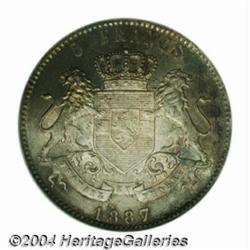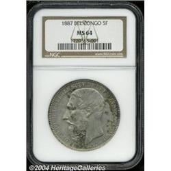 Leopold II 5 francs 1887, Bust left/Arms, KM8.1, MS64 NGC. Nice multicolored reverse toning with scattered small patches of russet color on the obverse. Important notice: Heritage usually auctions material at the rate of 200-250 lots per hour. On some occasions eBay Live bid software or the Internet may not be able to keep up with the pace of the auction. We recommend placing a realistic absentee bid now as insurance to avoid disappointment. Occasionally the auctioneer may eliminate or reject an eBay Live bid, and the auctioneer may also reopen a lot after the close of the eBay live bidding (usually because we missed an audience bid), and may reject your bid even if it shows you as the winning bidder. By bidding via eBay Live, you agree that Heritage may award the lot to another bidder at its sole discretion under the circumstances described above or any other reasonable circumstances. Also please note that all Heritage lots purchased through eBay Live carry a 20% Buyer's Premium. Please make sure you read the Terms and Conditions before you bid.