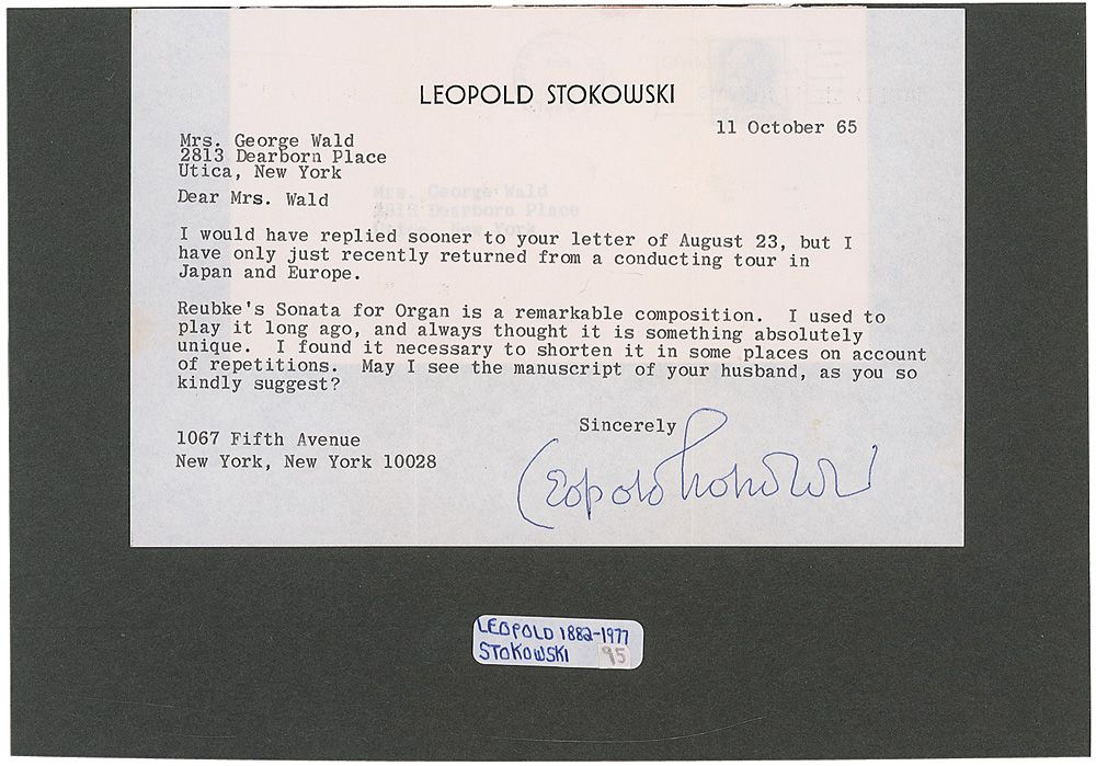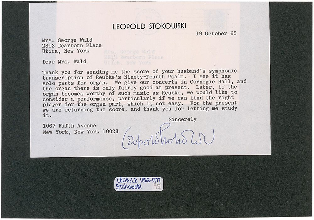Two TLSs, one page, 8.5 x 5.5, personal letterhead, October, 1965, addressed to Mrs. George Wald, both regarding her husband’s transcription of Reubke’s Sonata for Organ. In part: “Thank you for sending me the score of your husband's symphonic transcription of Reubke’s Ninety-Fourth Psalm. I see it has solo parts for organ. We give our concerts in Carnegie Hall, and the organ there is only fairly good at present. Later, if the organ becomes worthy of such music as Reubke, we would like to consider a performance, particularly if we can find the right player for the organ part, which is not easy.” Letters are affixed to their original mailing envelopes, which are affixed to opposite sides of a larger 11 x 8 sheet. In fine condition, with a vertical fold passing through each signature.