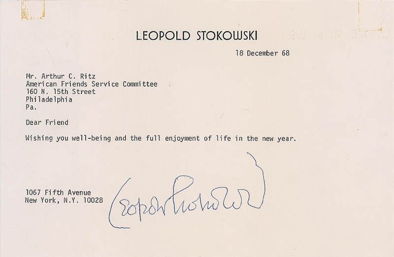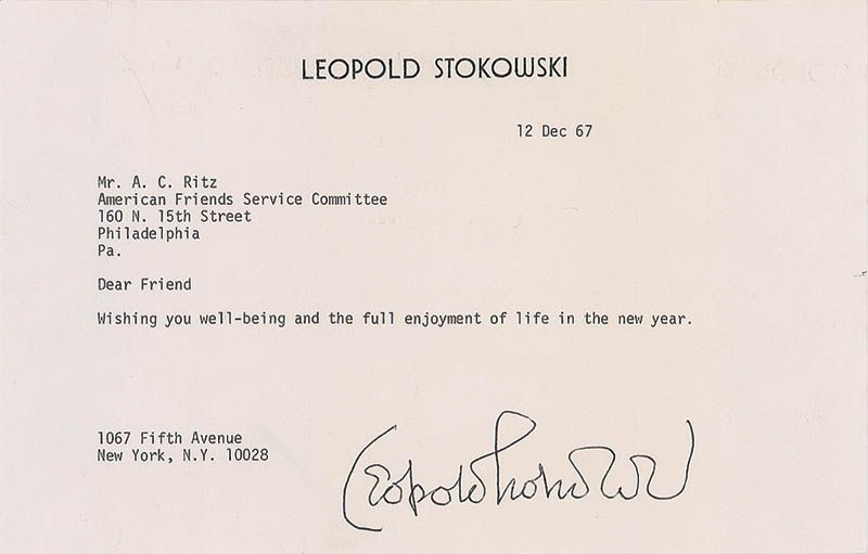 Two TLSs, each one page, 8.5 x 5.5, personal letterhead, dated 1967 and 1968, both with identical text. In full: “Wishing you well-being and the full enjoyment of life in the new year.” Each with two vertical mailing folds passing through a single letter of the signature, and one with toned tape remnants to the upper border, otherwise fine condition.