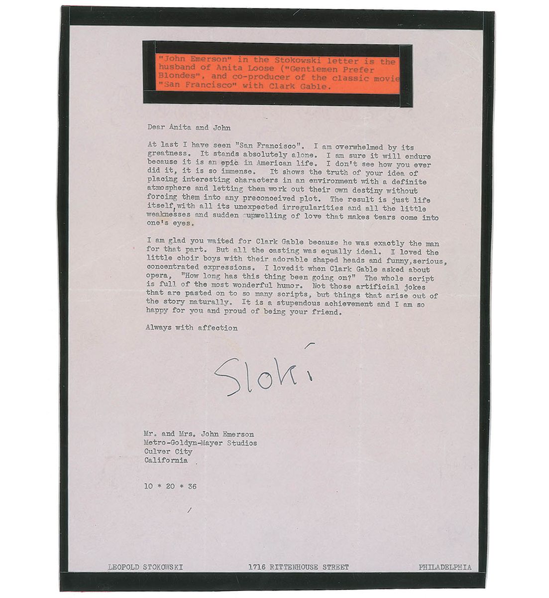 TLS signed “Sloki,” one page, 8.25 x 11, October 20, 1936. Letter to Mr. and Mrs. John Emerson at MGM Studios. In part: “I finally saw ‘San Francisco’…I am glad you waited for Clark Gable because he was exactly the man for that part. But all the casting was equally ideal…I loved it when Gable asked about opera ‘How long has this thing been going on?’ The whole script is full of the most wonderful humor. Not those artificial jokes that are pasted on to so many scripts, but things that arise out of the story naturally.” Letter has a black plastic border affixed to the edges, as well as a caption affixed to the top, also with a border. In very good condition, with aforementioned borders, intersecting folds, and scattered creases and wrinkles.