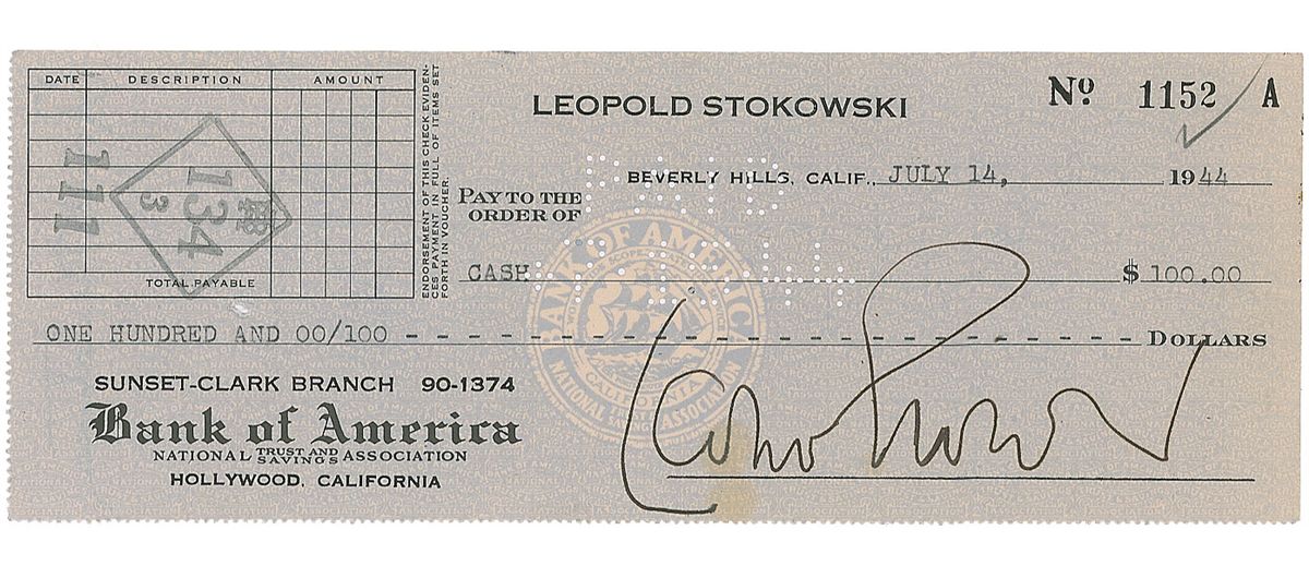 Personal check, 8.25 x 3, filled out in type and signed by Stokowski, payable to Cash for $100.00, July 14, 1944. In fine condition, with cancellation holes to body and a small spot of toning over a small portion of first name of signature.
