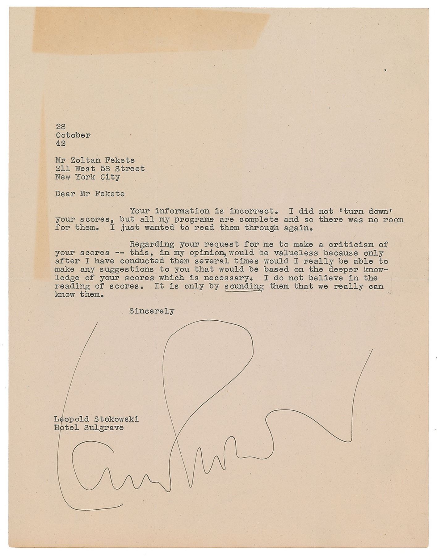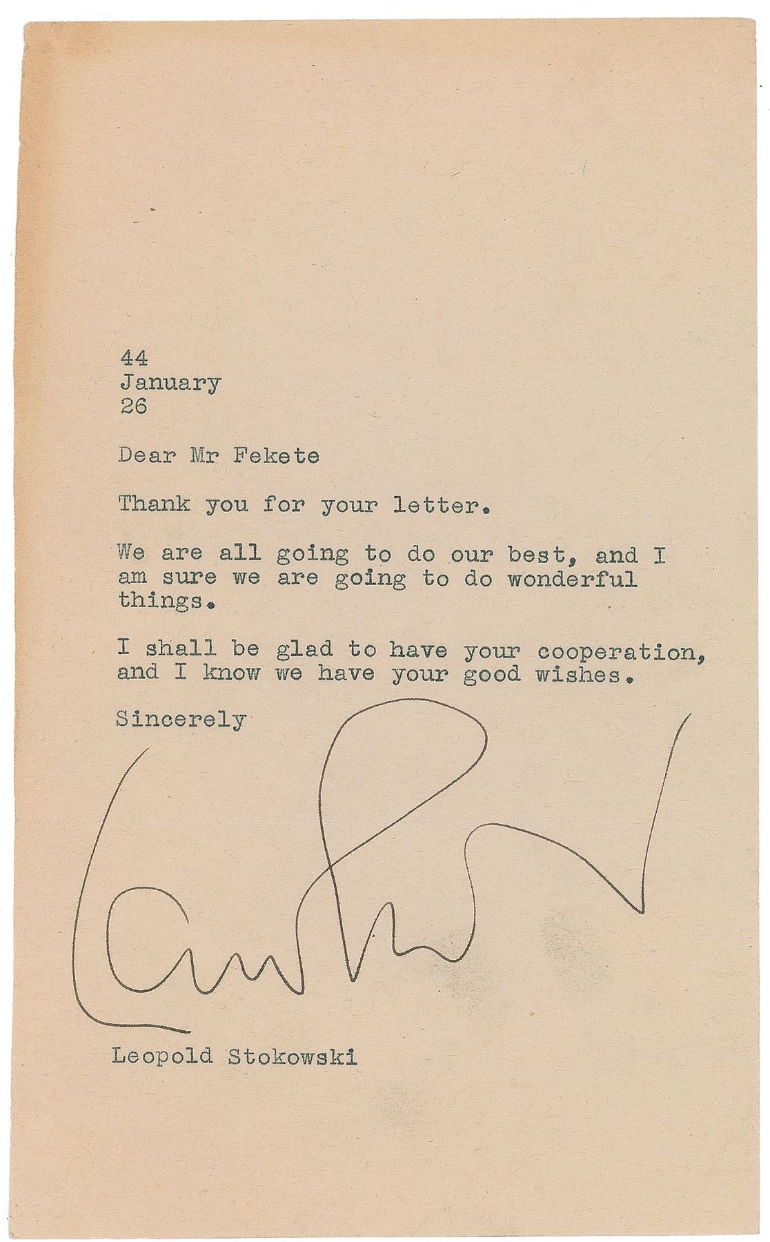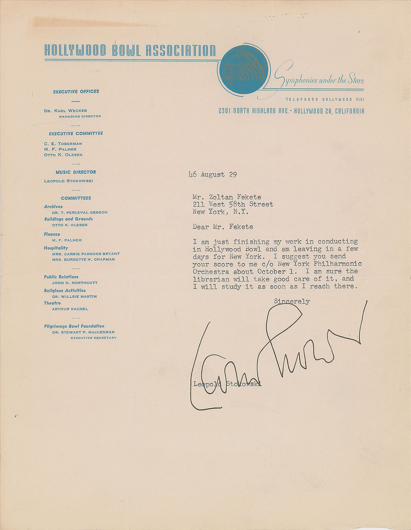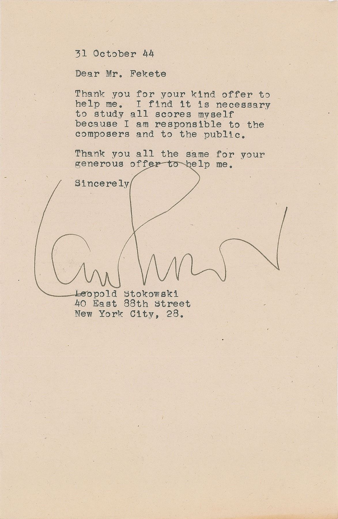 Four TLSs, each one page, ranging in size from 5.25 x 8.25 to 8.5 x 11, dated between 1942 and 1946, all addressed to the Hungarian-born conductor Zoltan Fekete. The first, October 28, 1942, in part: “Regarding your request for me to make a criticism of your scores—this, in my opinion, would be valueless because only after I have conducted them several times would I really be able to make any suggestions to you that would be based on the deeper knowledge of your scores which is necessary. I do not believe in the reading of scores. It is only by sounding them that we really can know them.” The second, dated January 26, 1944, in part: “We are all going to do our best, and I am sure we are going to do wonderful things.” The third, October 31, 1944, in part: “Thank you for your kind offer to help me. I find it is necessary to study all scores myself because I am responsible to the composers and to the public.” The last letter, written on Hollywood Bowl Association letterhead, dated August 29, 1946, in full: “I am just finishing my work in conducting in Hollywood Bowl and am leaving in a few days for New York. I suggest you send your score to me c/o New York Philharmonic Orchestra about October 1. I am sure the librarian will take good care of it, and I will study it as soon as I reach there.” In overall very good to fine condition, with some light creasing and toning.