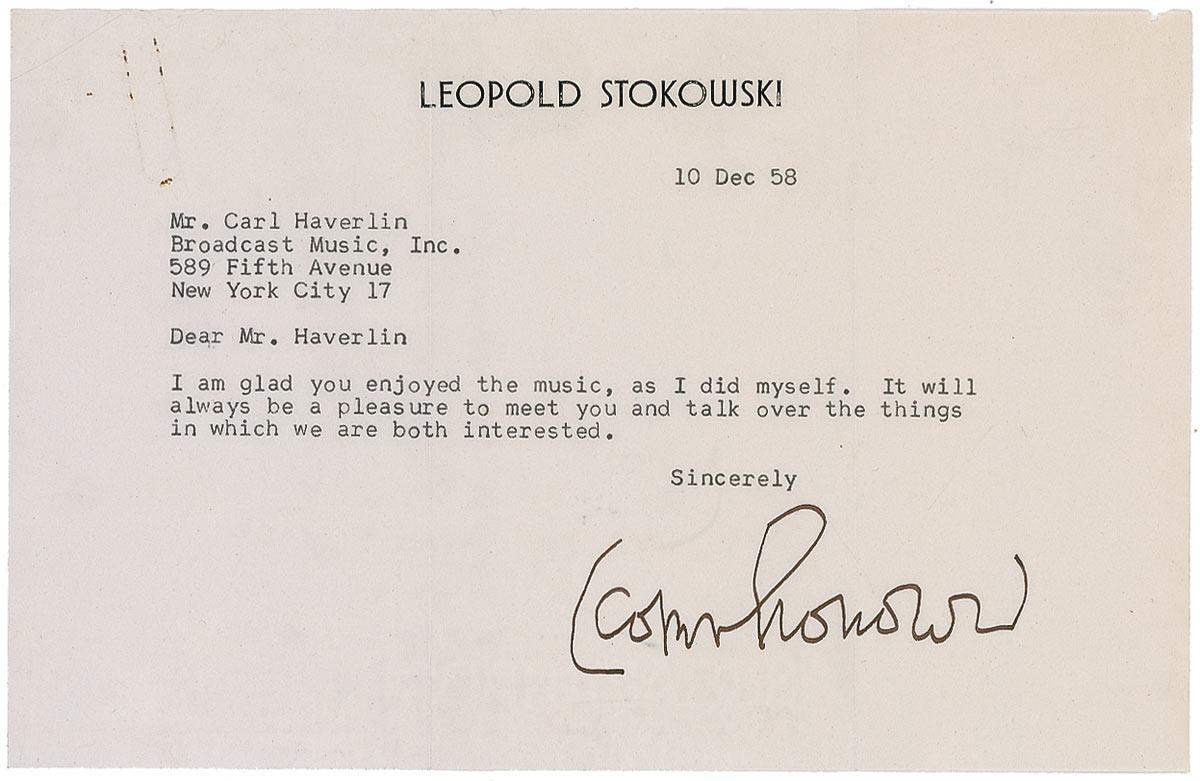 Colorful, durable, widely acclaimed conductor (1882–1977) best known for his memorable live-action role in the Disney classic Fantasia and for his dramatic, sometimes flamboyant manner on the podium. TLS, one page, 8.5 x 5.5, personal letterhead, December 10, 1958. Letter of thanks to a music executive for a previously sent letter. In full: “I am glad you enjoyed the music, as I did myself. It will always be a pleasure to meet you and talk over things in which we are both interested.” In fine condition, with vertical fold through a single letter of signature, and a rusty paperclip impression to top edge. Accompanied by a carbon of the letter sent to Stokowski. RRAuction COA.