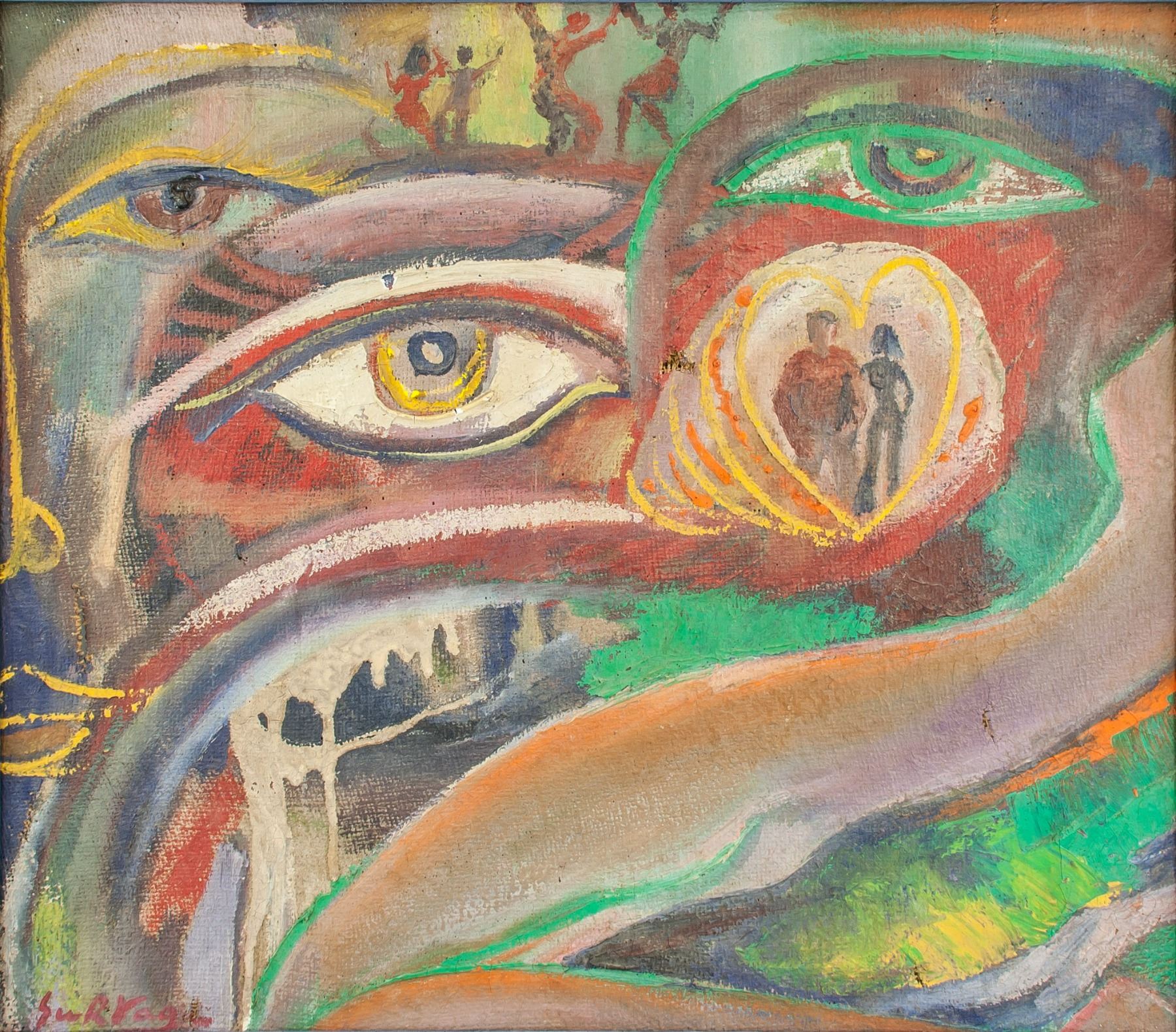 Oil on canvas, featuring abstract painting of eyes. Signed and attr. Leopold Survage (1879-1968). Signature on the lower left corner. Torn canvas on left side of the painting. Léopold Survage was a Finnish-born French artist who produced dynamic abstractions of city scenes. Fracturing perspectival space into planar segments, he constructed multiple viewpoints within larger compositions. In this way, structures, flowers, trees, curtains, and birds are reorganized into a fragmented yet coherent pictorial space. In what is perhaps his best-known series, Colored Rhythm: Study for the Film (1913), Survage sought to create a sense of animation through the static medium of painting. “Colored music is in no way an illustration or an interpretation of a musical work,” he once explained. “It is an autonomous art, although based on the same psychological principles as music.” Born on July 31, 1879 in Lappeenranta, Finland, Survage intended to take on his father’s piano factory business but instead studied at the Moscow School of Painting, Sculpture, and Architecture, where met Alexander Archipenko. The artist moved to Paris in 1910, where he became the studio mate of Amedeo Modigliani and began designing sets and costumes for Sergei Diaghilev’s Ballet Russes. After coming under the influence of the Surrealist André Masson in the 1930’s, Survage’s subject matter became increasingly mystical. PROVENANCE: Southern Ontario Estate. 21 x 24 in