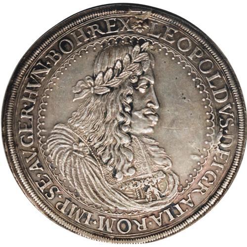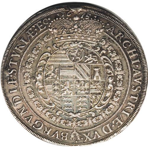 <B>Leopold the Hogmouth Broad 2 Taler 1675-IAN Graz, </B></I>KM1269x, Davenport A3232, choice toned AU, small mount trace at the top, sharply detailed and attractive.<BR><BR><b>Shipping:</b> Coin/Currency (<a target="_blank" href="http://www.heritageauctions.com/common/shipping.php">view shipping information</a>)