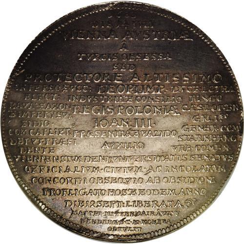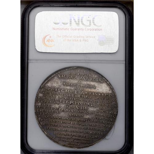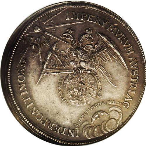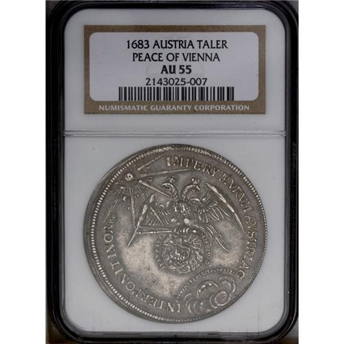 <B>Leopold the Hogmouth Show Taler 1683 on the Relief of Vienna, </B></I>Vogl.-239, HCz. 2468, Herstal 1845. Designed by M. Hofmann. The obverse portrays a double eagle brandishing a sword and sceptre atop a globe. The reverse has a 21 line legend describing how the Polish King John III Sobieski, with 20,000 troops, relieved the Turkish siege of Vienna in 1683 and drove them back to the Raab, and thereby freed Hungary. By leading the decisive Polish cavalry charge himself, Sobieski was acclaimed the hero of Christendom. AU55 NGC (where described as a taler).