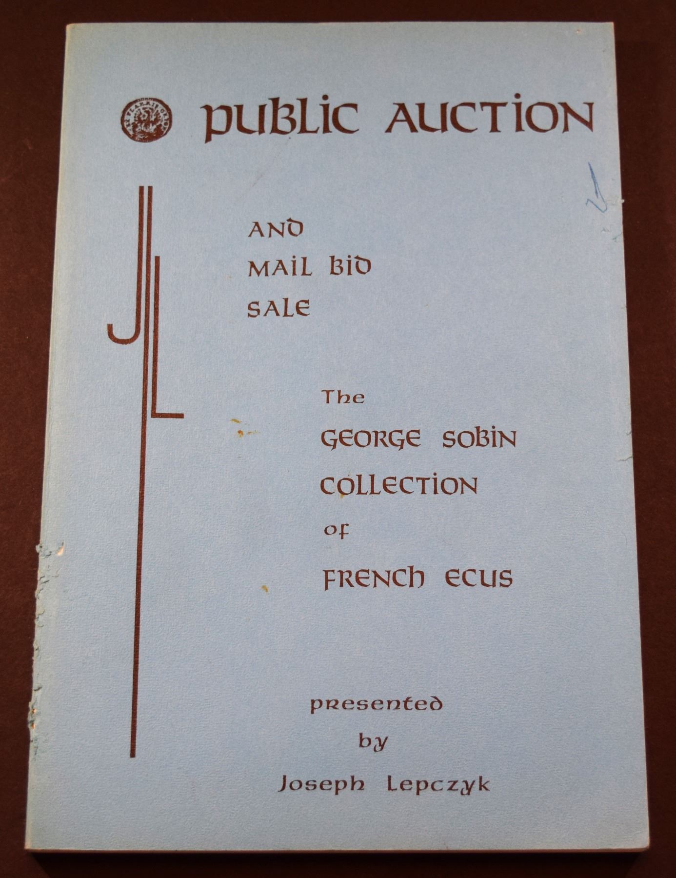 Lepczyk, Joseph. THE GEORGE SOBIN COLLECTION OF FRENCH ECUS - PUBLIC AUCTION AND MAIL BID SALE. March 7-8, 1977. 1-1336 Lots. 8vo. This catalog includes the George Sobin Collection of French Ecus, which is organized alphabetically by mint mark and within mint listings, chronologically by type. Each lot is very well described and extensively plated. It is a timeless, important reference for this series and also very scarce; PRL; Gengerke 20[371]. Lot weight: 1 lbs 0oz. Subject(s): French Coinage.