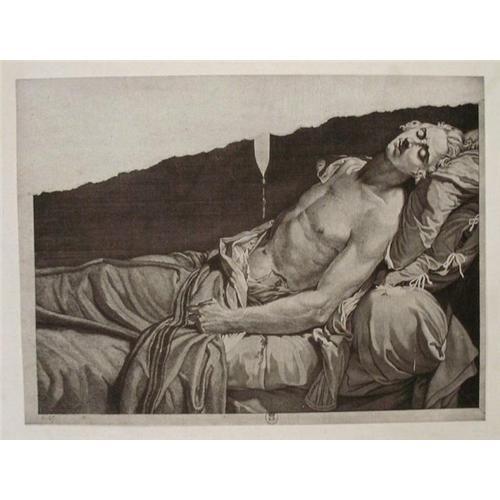 Stricking engraving by Pierre-Alexandre Tardieu (1756-1844) after Jacques-Louis David's "Lepeletier on his death-bed." Louis LePeletier de Saint Fargeau was a noble who voted for the execution of Louis XVI and was assassinated shortly after. He became the first martyr of the French revolution. Text on the reverse reads as follows: Bibliotheque Nationale, Cabinet des Estampes, Chefs-D'Oeuvre et Pieces Uniques, Ecole Francaise, XVII Siecle, Pierre Alexandre Tardieu, Le Pelletier de St. Fargeau Mort d'apres Louis David, Gravure au Burin. In very good condition as shown. Mounted on larger sheet with toning consistent with age and signs of wear that can be concealed with a mat when framing. Please ask questions, request additional photos and shipping costs before buying.