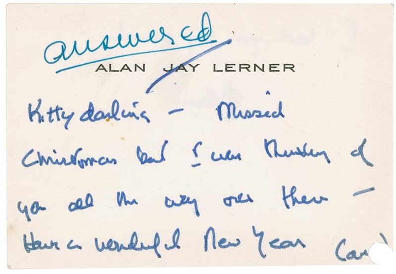 Two items: a one-page ALS, both sides, from Alan Lerner, signed “Alan,” 4.25 x 2.75, no date. In full: “Kitty darling—Missed Christmas but I was thinking of you all the way over there—have a wonderful New Year. I love you very much”; and a one-page ALS from Frederick Loewe, signed “Fritz,” 5.75 x 7.5, no date. In full: “Darling Kitty! Thank you for your beautiful speech about me. I love you!” In fine condition, with a punch hole at the lower right corner of Lerner’s letter and a central horizontal crease on the Loewe letter. Accompanied by two unsigned photos.