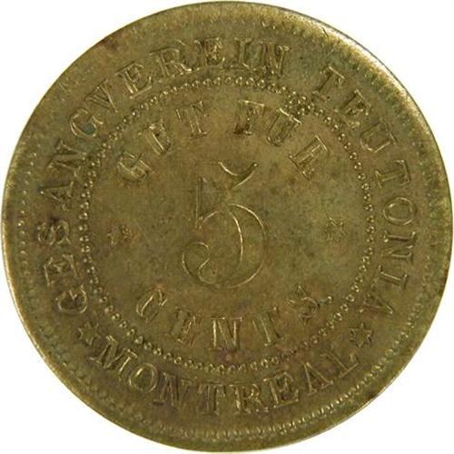Leroux 1050, Gesangverein Teutonia, Montreal, Gut fur 5 Cents, Brass, Uncirculated
