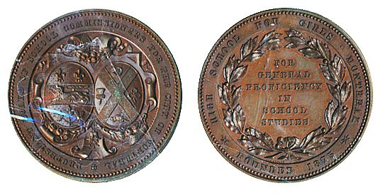 Obv: PROTESTANT BOARD OF SCHOOL COMMISSIONERS FOR THE CITY OF MONTREAL. Arms of the city of Montreal. Rev: HIGH SCHOOL FOR GIRLS, MONTREAL, FOUNDED 1875. Copper. 58mm. AU. J.S. & A. B. Wyon.