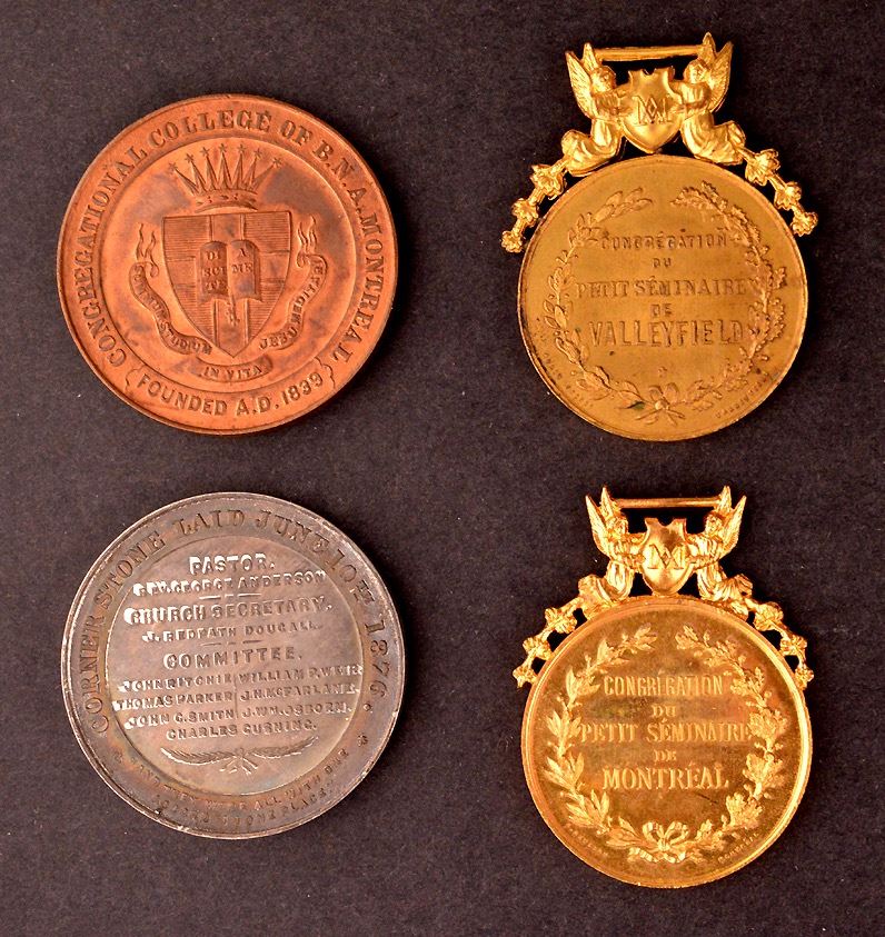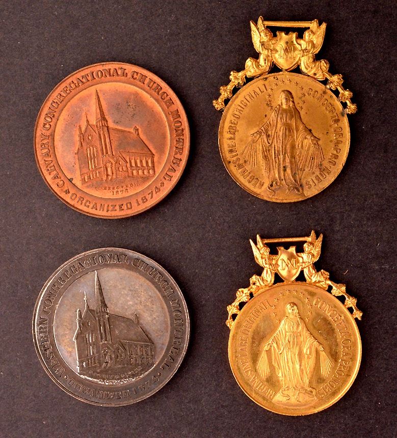 Congregation Du Petit Seminaire de Montreal, Ae, gilt, 38mm, Lr.1309, EF; Another, for Valleyfield, VF; Western Congregational Church of Montreal, 1876, Wm, 45mm, Lr.1440, EF, nice toning; Calvary Congregational Church of Montreal, 1876, Ae, 45mm, Lr.1441, EF; total 4 medals.