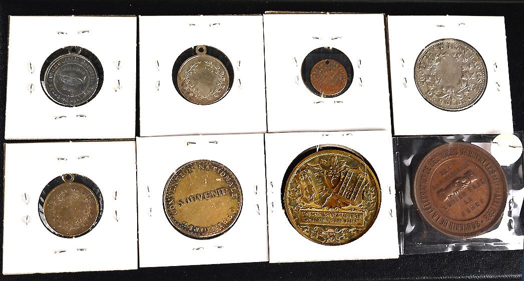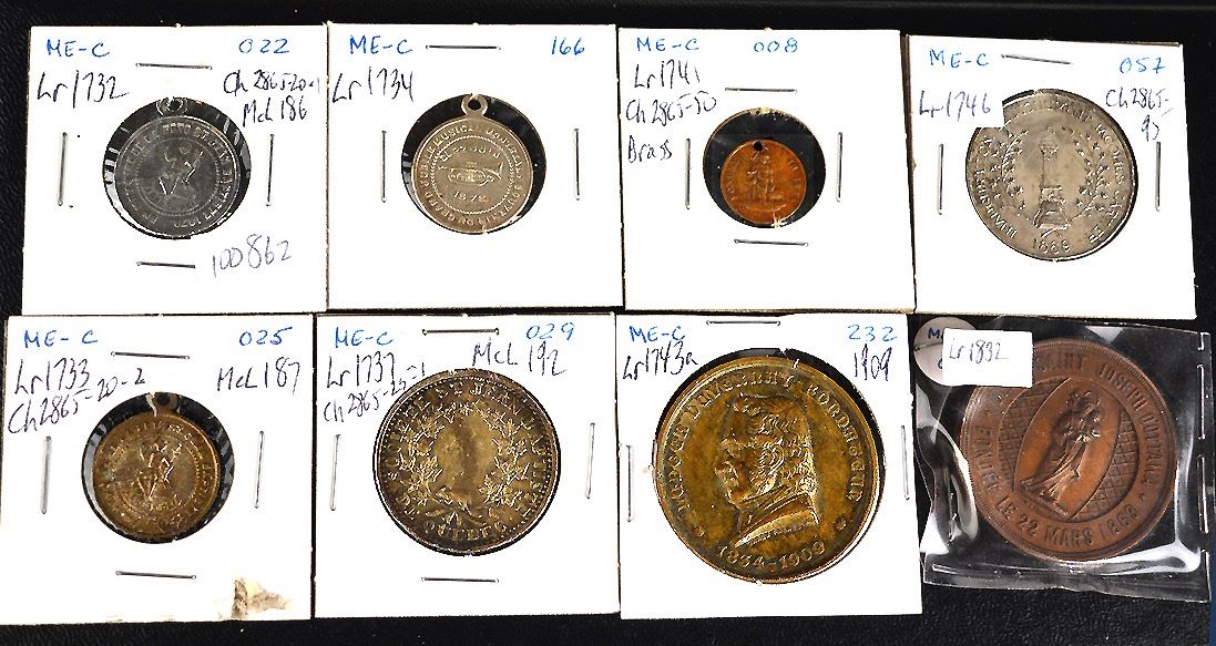 Grand Music Jubilee, Montreal, 1878, Wm, Lr.1732, CH#2865-20-1, McL-186; Lr.1733, CH#2865-20-2, McL-187; Lr.1734, CH#2865-20-3, McL-188; Lr.1737, CH#2865-25-1, McL-192, numerous marks; Lr.1741, CH#2865-50, Brass; Ludger Duvernay, 1909, Brass, Lr.1743a; Monument Jacques Cartier, 1889, Wm, Lr.1746, CH#2865-95; Lr.1832, Ae; VG to EF, most VF. Total 8 pcs.