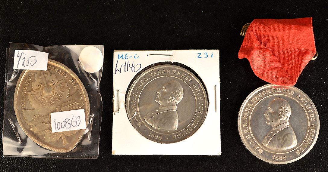 Cardinal Taschereau, 186, Lr.1140, (2), one with pin and ribbon; other without hanger; Colonisation Candienne, Lr.1250; All Wm, VF, or so. Total 3 pcs.