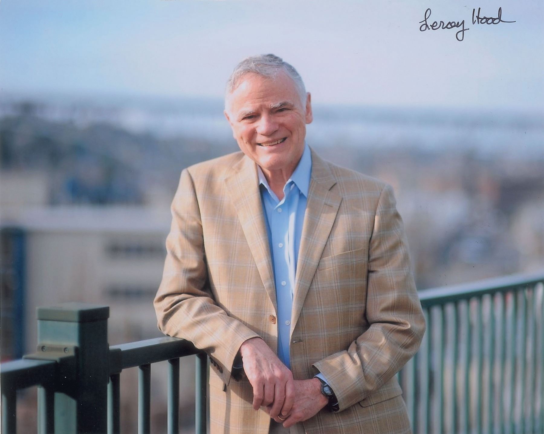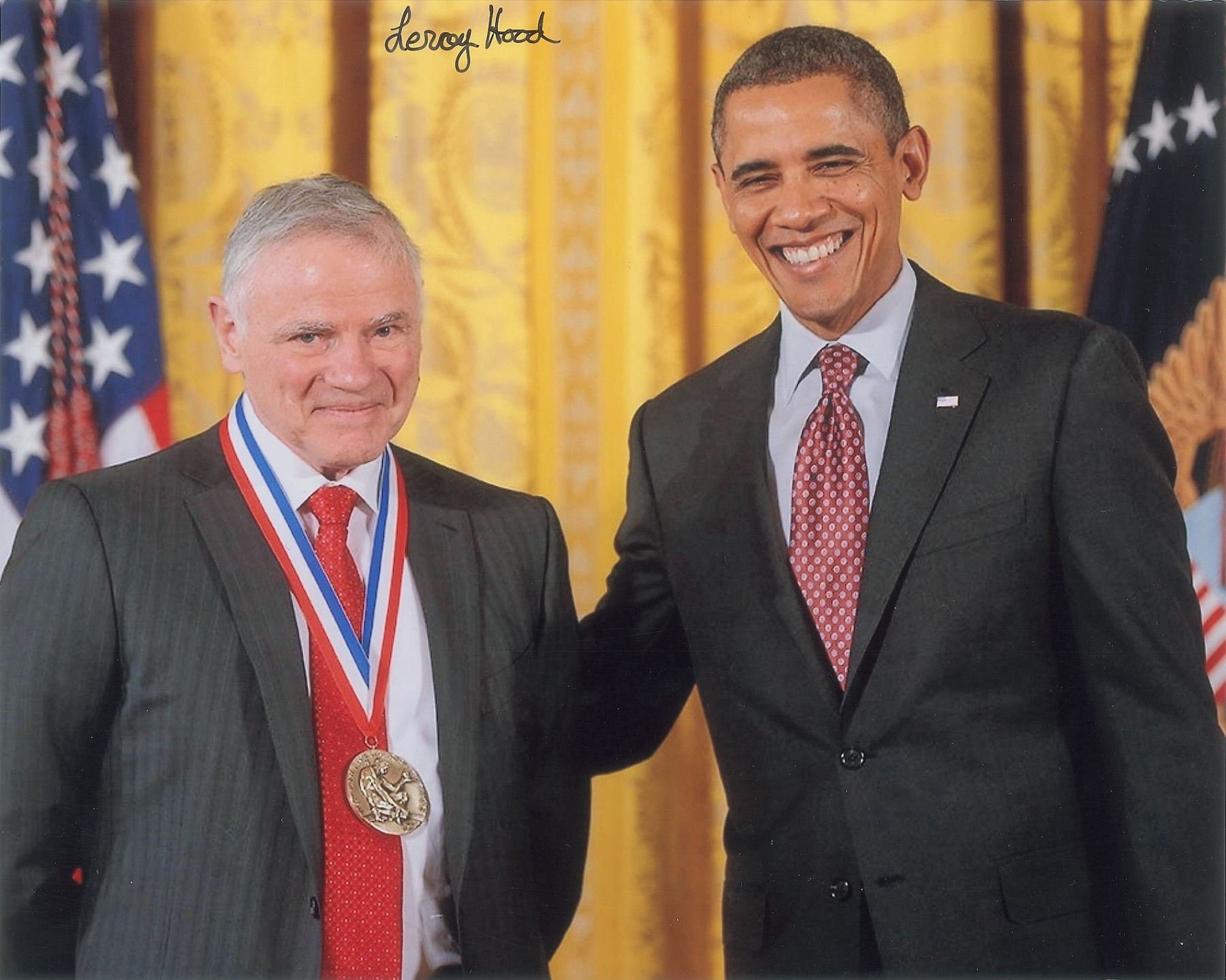 American biologist (born 1938) who has developed groundbreaking scientific instruments which made possible major advances in the biological sciences and the medical sciences. Three color glossy photos, 8 x 10 and 10 x 8, each signed in thin black felt tip by Leroy Hood, with images including: Hood receiving the 2011 National Medal of Science from President Barack Obama; Hood posing on a railing outdoors; and a close-up pose of Hood peering between laboratory flasks. In overall fine condition. Accompanied by a personal Institute for Systems Biology business card belonging to Hood, who has signed the card in black felt tip.