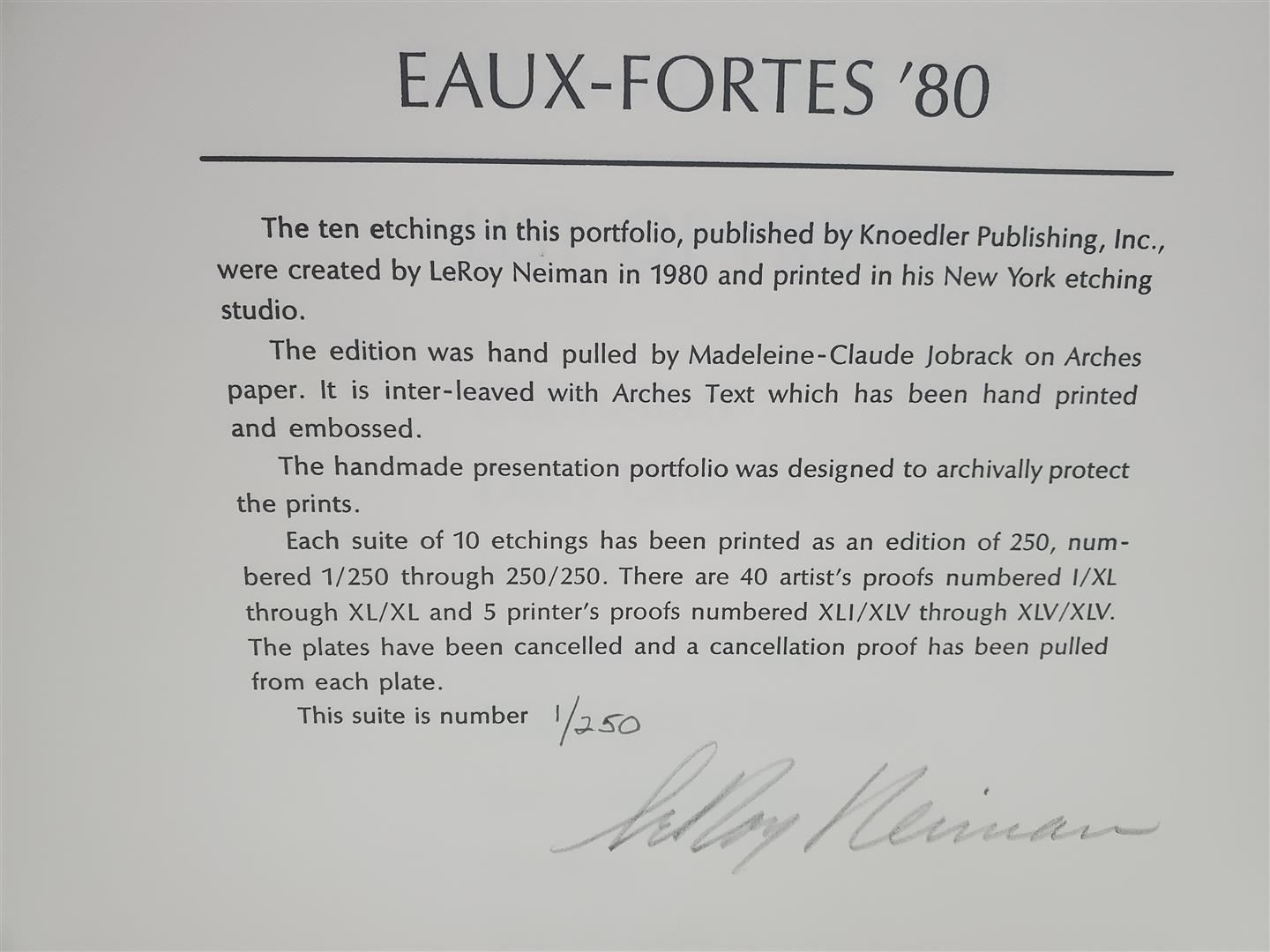Leroy Neiman "Eaux Fortes" Suite of 10 Pieces: Bovine Family Daily Double Dalmatian Game of Life Into the Open Midnight Cheetah Rodeo Six Nudes Soccer Stud Poker List Price $37,500 Up for sale is "Eaux Fortes" Suite of 10 pieces Limited Edition Etchings on Paper, each hand-signed and numbered includes a Certificate of Authenticity. Titles: Bovine Family: Size 8 7/8" x 14 3/4" #1/250 Daily Double: Size 11 7/8" x 7 7/8" #1/250 Dalmatian: Size 24 1/2" x 19 3/4" #1/250 Game of Life: Size 19 3/4" x 24 1/2" #1/250 Into the Open: Size 13 7/8" x 17 7/8" #1/250 Midnight Cheetah: Size 5 1/8" x 12 5/8" #1/250 Rodeo: Size 16 1/2" x 18 1/2" #1/250 Six Nudes: Size 25 1/2" x 17 3/4" #1/250 Soccer: Size 12 7/8" x 14 7/8" #1/250 Stud Poker: Size 19 3/4" x 24 1/2" #1/250 MEDIUM: Etching on Paper CONDITION: Excellent EDITION SIZE: A limited edition of 250 numbered impressions, signed by the artist. RELEASE: 1980 Our latest acquisition of Leroy Neiman is from a private collector who was a personal friend of the artist. As such, she was able to attain the lowest numbers of much of the collection when the pieces were released. " #1s, 2s and 3s." You now have the opportunity to own these rare Neiman's and add them to your collection.