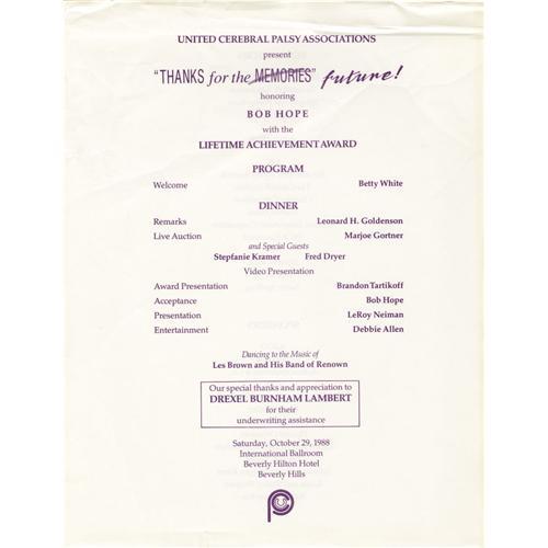 <B>Leroy Neiman Signed Bob Hope Tribute Program Book.</B></I> A Bob Hope Lifetime Achievement Award program book from a 1988 ceremony by the United Cerebral Palsy Association. The cover portrait of Hope is signed by artist Leroy Neiman in black marker. In Excellent condition with mild wear.<BR><BR><b>Shipping:</b> Flat Material, Small (<a target="_blank" href="http://www.heritageauctions.com/common/shipping.php">view shipping information</a>)