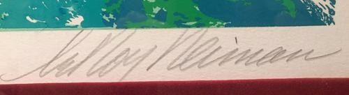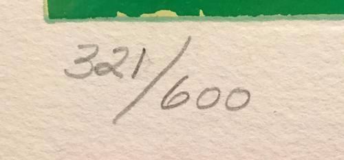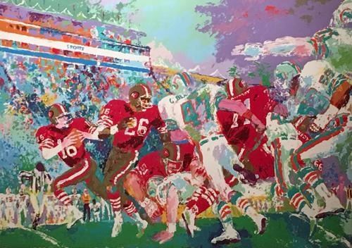 Extremely collectible investment level limited edition (out of 600) Leroy Neiman color serigraph. hand signed by the artist lower right. Comes with red velvet matte, and a vintage style golden metal framing, which only accentuate the beauty of this wonderful work of art. also has Plexiglas screening to better safeguard the work. Comes with a certificate of authenticity. Art image size is: 26 7/8 x 38 inches. Framed: 38 x 49 inches. From Leroy Neimans own website: this is a scene embodying the excitement and action of pro football. From Neimans position on the field, he was able to directly observe and experience the play seen in this image. His vivid display of the clashing bodies has added the auditory quality of being in the arena. According to the artist, this picture consists of five distinct planes: 1) The grouping of the players and their entangled bodies. 2) The referee in his stripes charging towards the players. 3) The players bench with their coach seen in his signature sweater. 4) The stadium itself, capped with tented canopies, which create a feeling and look of a medieval jousting match. 5) The sky itself- overcast, low and as ominous looking as the players themselves in this classic Neiman football image the viewer can fell that he is in the middle of the action, and the decision to either run with the ball or pass is the viewers as well. His experience becomes totally elasticized by the mystery of not knowing what the quarterback will do next. Size: 38X49 inches.