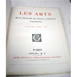 Les Arts Revue Mensuelle des Musées, Collections Expositions. (The Monthly Reviewed Arts of the Museums, Collections Expositions.) Bound Magazines for the year 1906. All 12 Issues. Folio, bound in Maroon and muted Green cloth, gilt titles, TEG. Illustrated in B&W. App. 340 pages with Table des Matieries in the rear, text in French. Very Good, Contents Near Fine.. One of 5 such volumes now at Auction here at AuctionBug!~