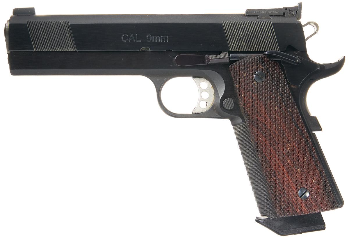 Features front and rear side serrations a lowered and flares ejection port and BoMar sights. The frame runs the length of the slide and features an ambidextrous thumb safety, a speed hammer, beveled magazine well and a checkered front strap. Fitted with checkered rosewood grips. Complete with the original box numbered to the gun.