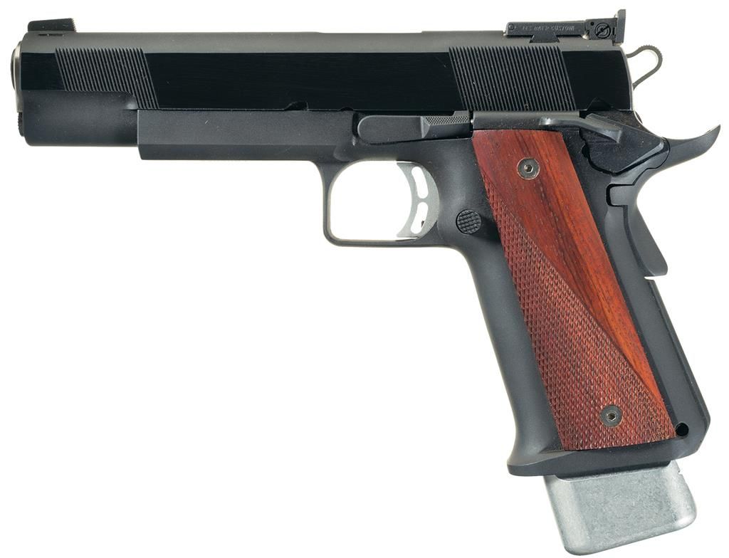 This Les Baer is built using a Caspian high capacity frame. It has a serrated blade front sight and a fully adjustable rear sight. The trigger has two lightening cuts and is adjustable for overtravel. Has an extended ambidextrous thumb safety and a ridged grip safety. Fitted with a set of partially checkered walnut grips.